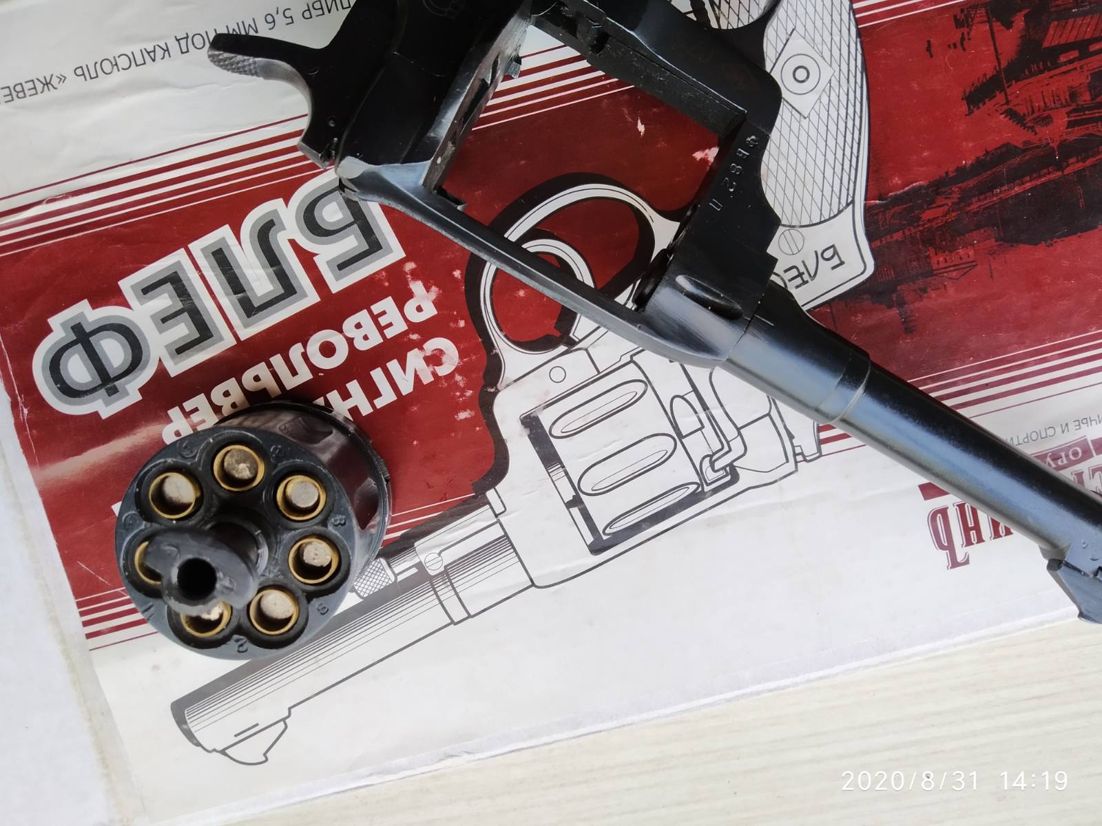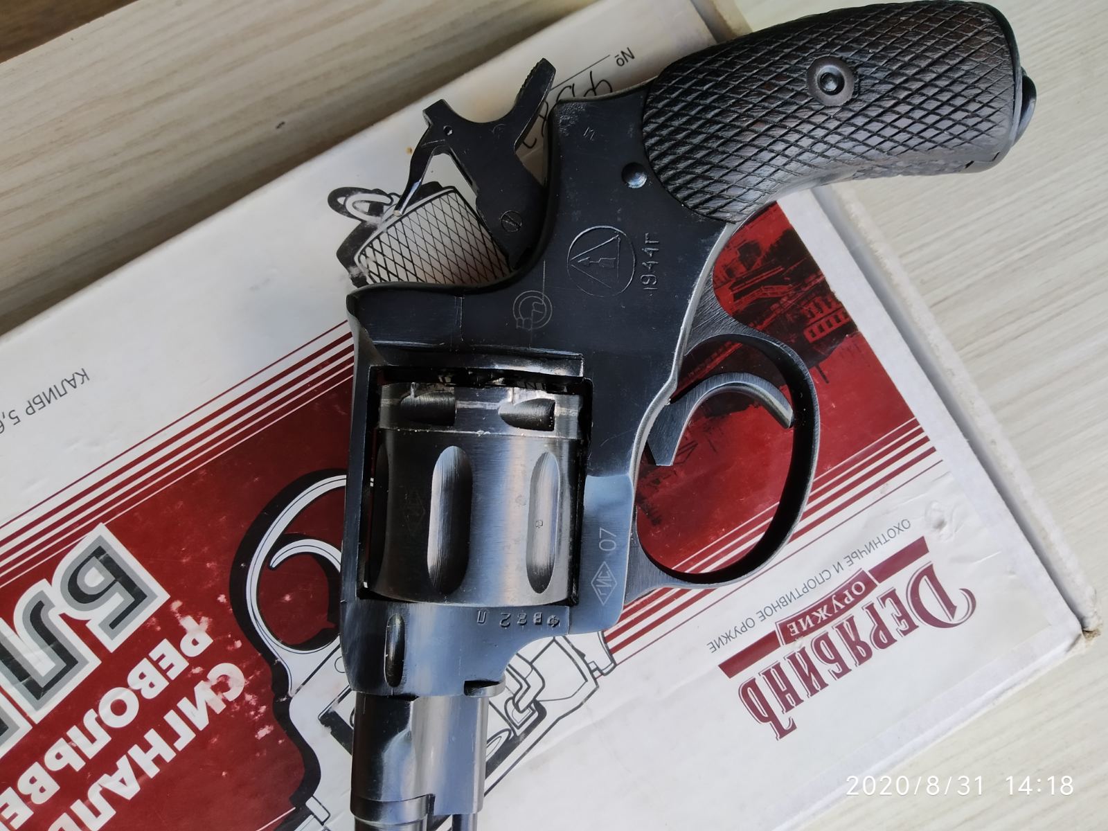 Сток, не шлиф., хорошая геометрия, накладки по году, ижевский. Все детали на треугольниках. Имитаторы патронов на магнитах. Деактив старый - продувается. Абсолютно синхронный. Дополнительный тульский казенник для модернизации под хилти. Кобура с протиркой. Паспорт. Коробка, оригинальный кулек.