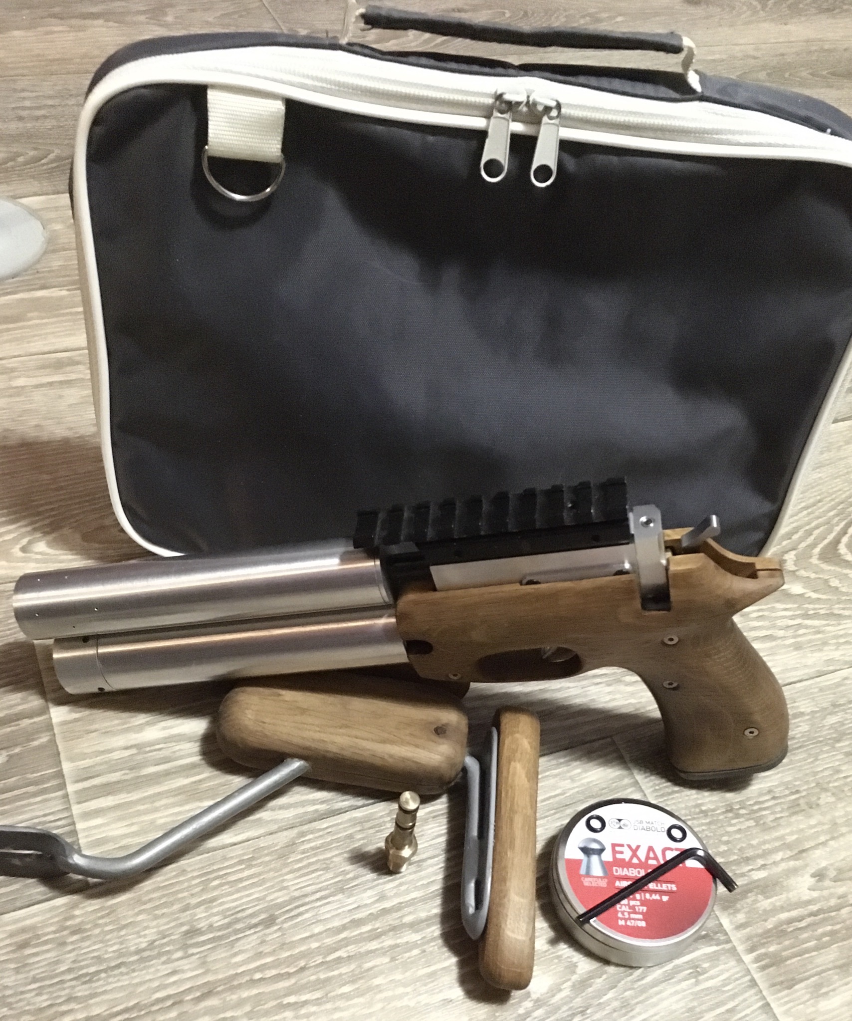 От себя. Удобный, тихий, точный. Одинаково отлично летели, как JSB 0.547, так и ЛЮМАН ФТ 0.55 (разницы не увидел). Самые свежие фото с каликом беломо. Приклад хендмейд(дуб). Рукоять и приклад пропитаны: канифоль, воск, льняное масло. Место крепления приклада на рукояти оцинковано, остальное окрашено.