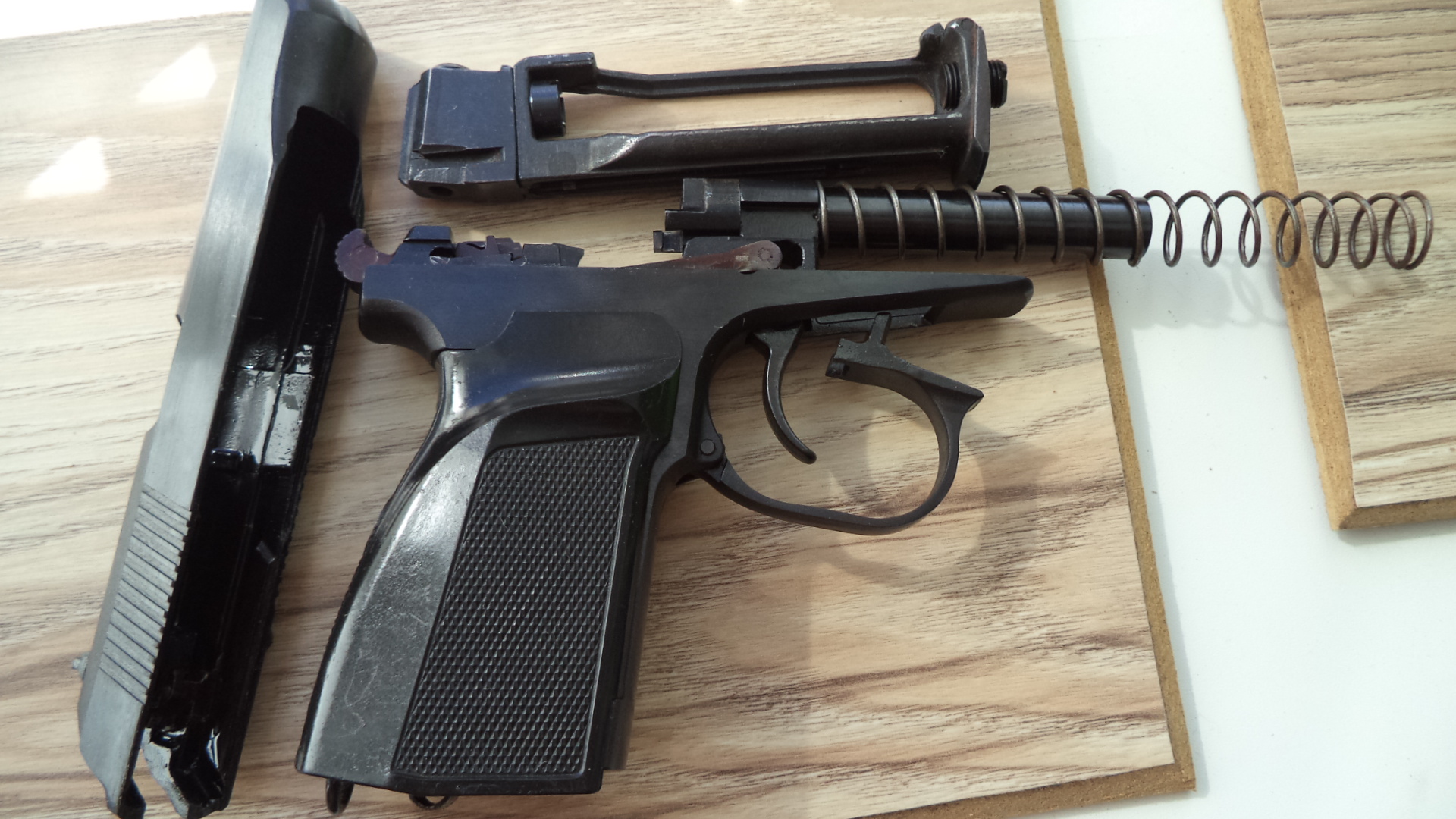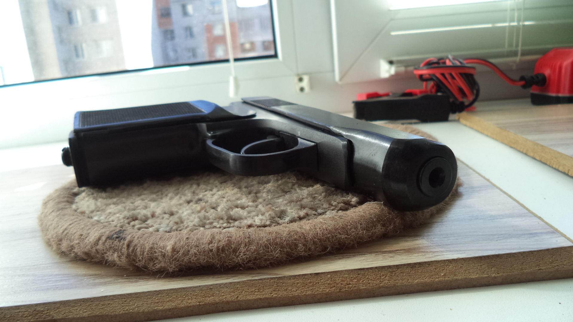 МР в новом воронении. Рукоятка черный ( ПММ ) полнотелый бакелит, Скоба фигурная точеная , курок тяга красные, ЗЗ дутая, ствол длинный.Борода с скосом ,потайной винт баллона,убраны насечки на рукояти. Целик широкий с номером , курок тоже. Гайка с зацепом , голова с проточкой.