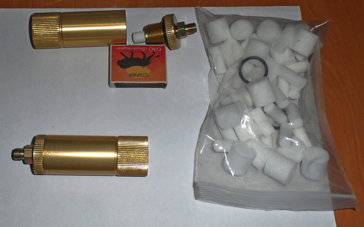 3. Осушитель (маслоотделитель) большой. В комплекте много запасных патчей, резинки, фторопласт. Материал изготовления Д16Т. Давление 300 бар (30 МПа). Резьбы M10x1.