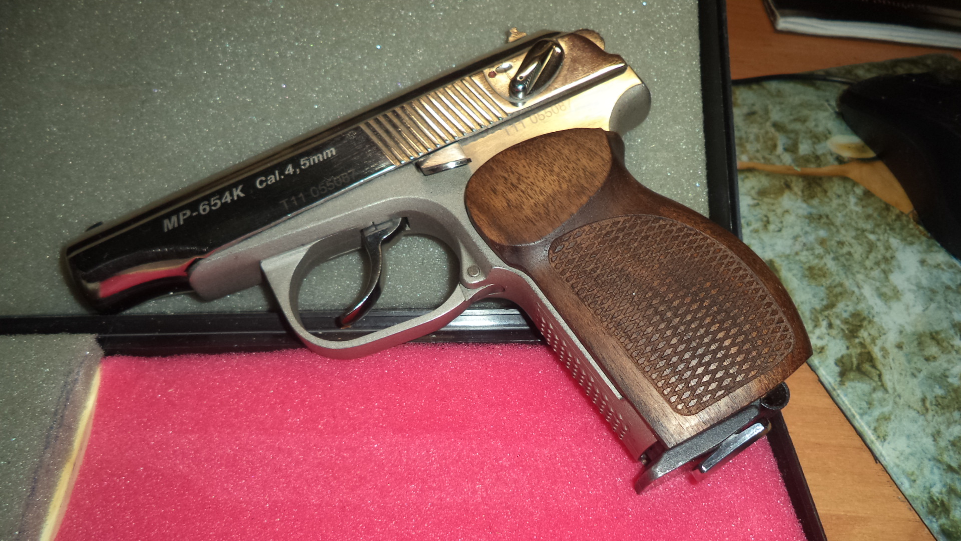 Кроме никелировки в магазине сделан специальный болт поджима баллона. Установлена деревянная рукоять( красивый темный цвет). В комплекте пистолет, кейс. При желании покупателя кобура, поясная - плюс десять рублей. Цена 300р . Сморгонь 80336863322.