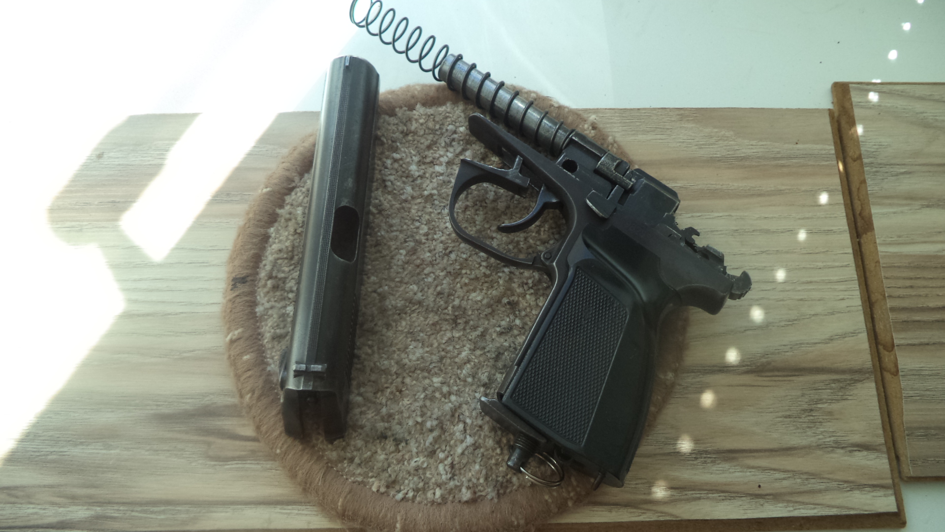 Продам МР654К 300р. Образца самых первых выпусков 1998 г. Борода малая, все надписи присутствуют, гайка и голова магазина с зацепом, антиблик полуширокий, магазин с болтиком поджима баллона имеет антабку ( зажимать баллон можно без ключа) , клапан первого выпуска утоплен в голову магазина , курок с четырьмя насечками. стволик длинный без проточки,тяга и шептало красные ,рукоятка от ПММ с болтиком от его же, установлена фторопластовая прокладка ствола. Могу установить деревянную рукоять , будет немного дороже. Состояние соответствует годам , все таки 25 лет. Потерт хорошо. Все вопросы по телефону 80336863322. Полностью исправен.