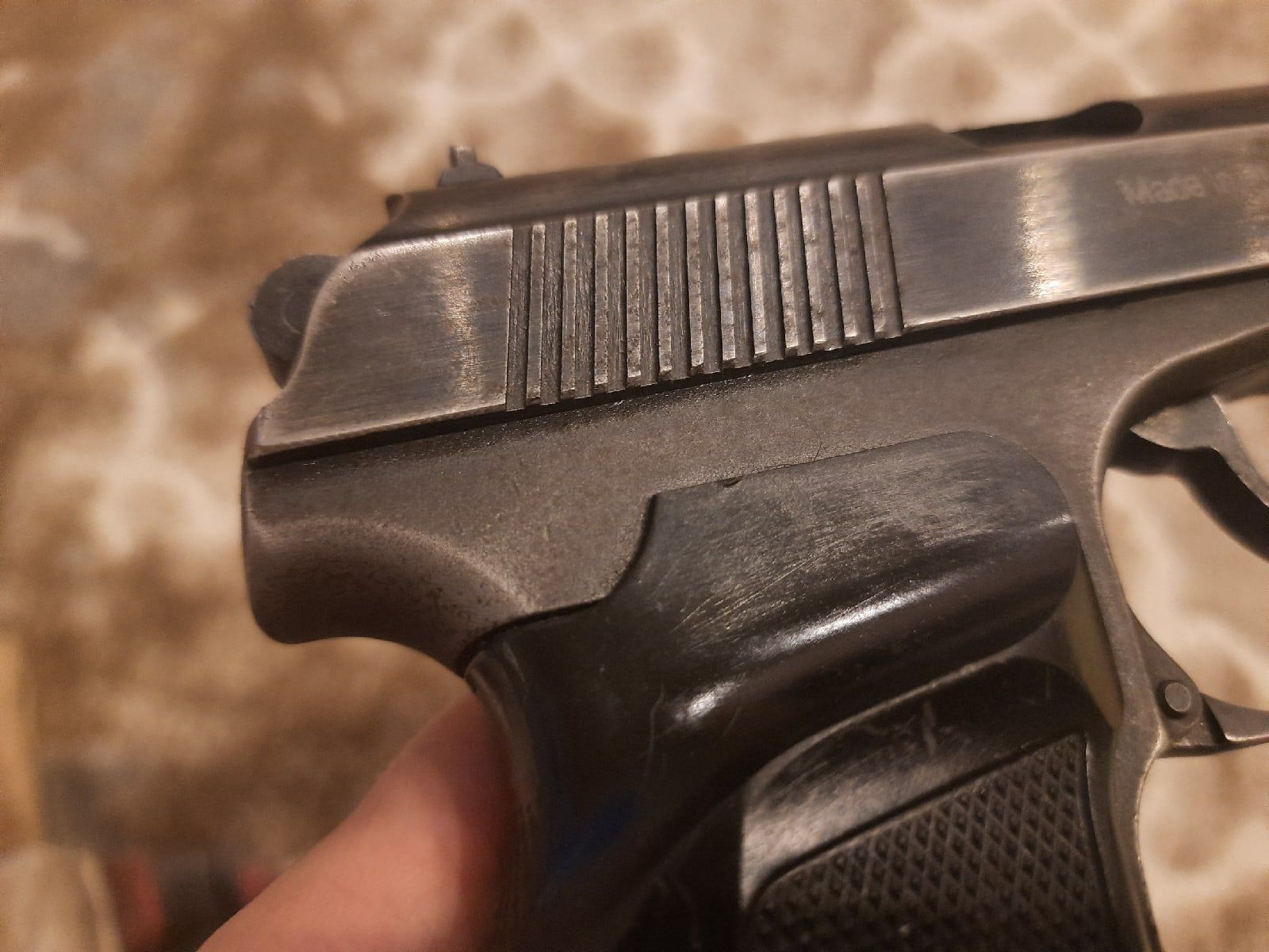 Камрады, может знатоки подскажут что за девайс такой. На днях приобрел. 1999 год выпуска. Относительно широкий антиблик, полноценная борода, овальное окно выброса, но без пропила под экстрактор, затвор фрезерованный. Имеется небольшая фаска внизу затвора.
