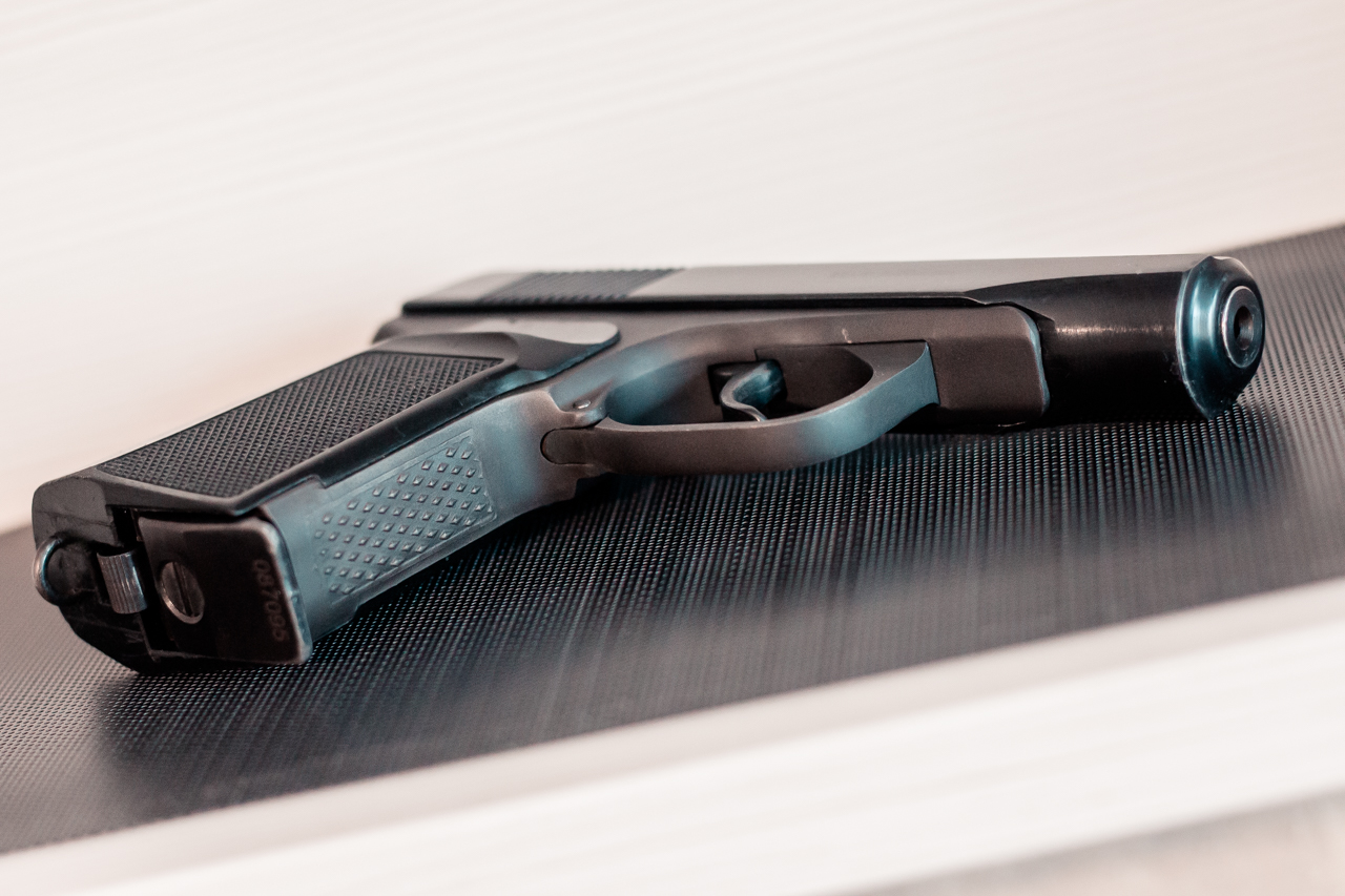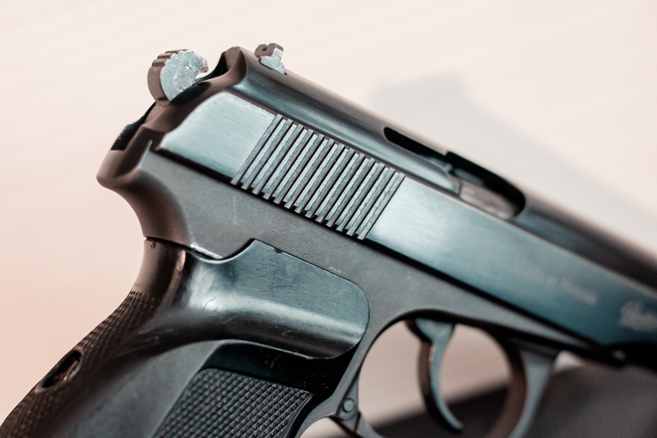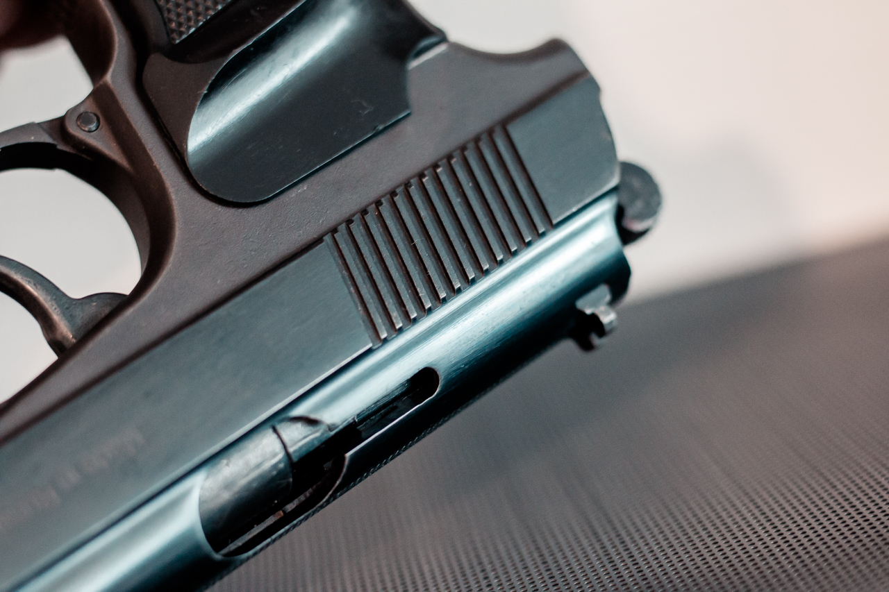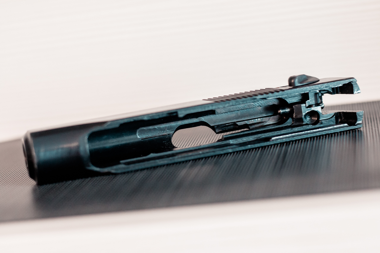 Кованый затвор, овальное окно с пазом выбрасывателя, широкие непиленные направляющие рамки, широкий антиблик, ровные глубокие насечки на затворе с хорошей фаской внизу, полнотелая накладка ПММ с антабкой.