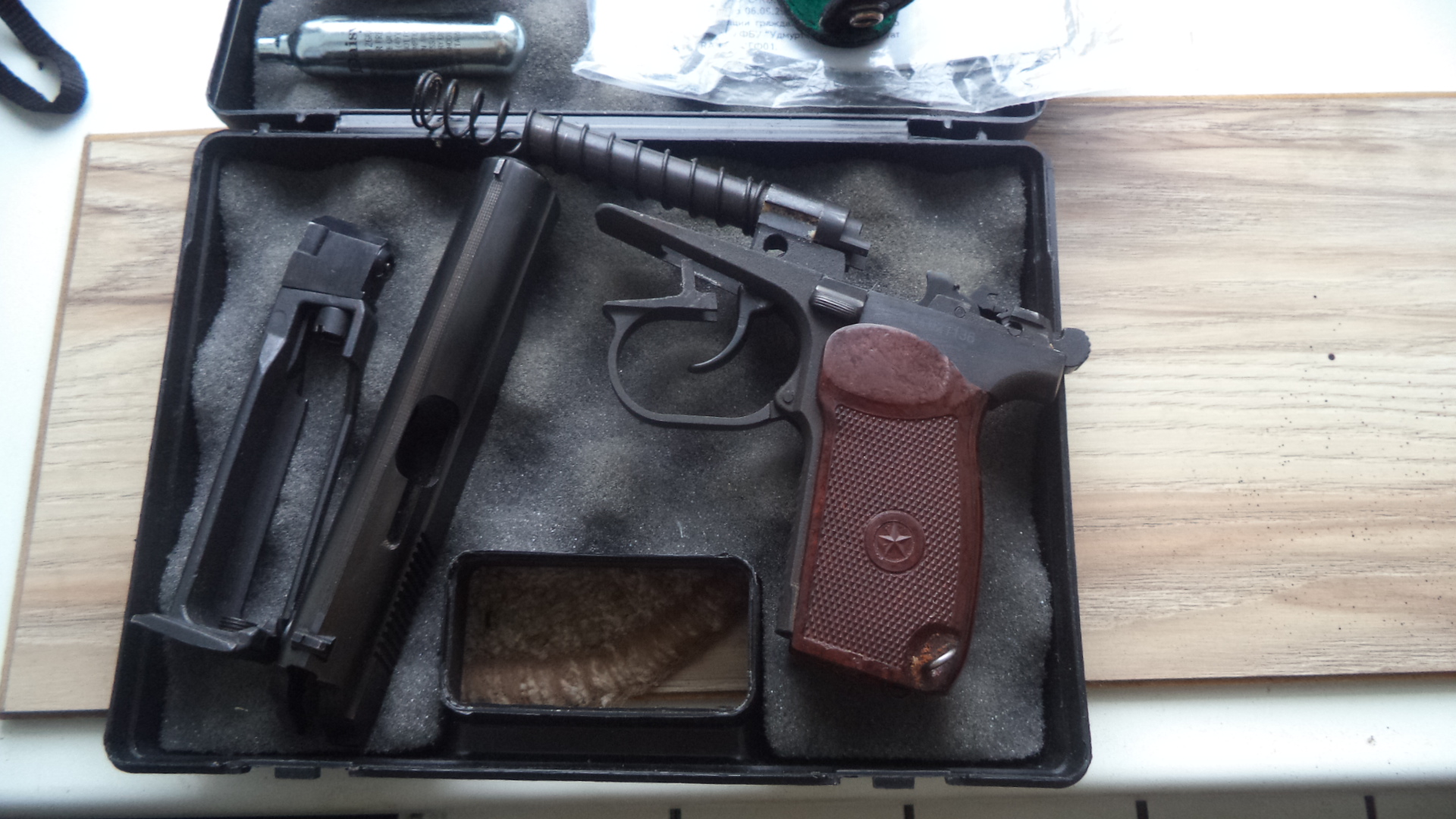 МР654К24. 450р. Состояние нового ( на направляющей ствола видно заводская смазка). Установлена бакелитовая рукоятка, дутая ЗЗ . Есть паз для выбрасывателя. В комплекте кейс Байкал , кобура , документы, инструкция, ключик, шарики , баллон, резиновая накладка для предотвращения скольжения руки, сам пистолет. Зазора между гайкой ствола и магазином нет. Все вопросы по номеру 80336863322. Вайбер . Почта.