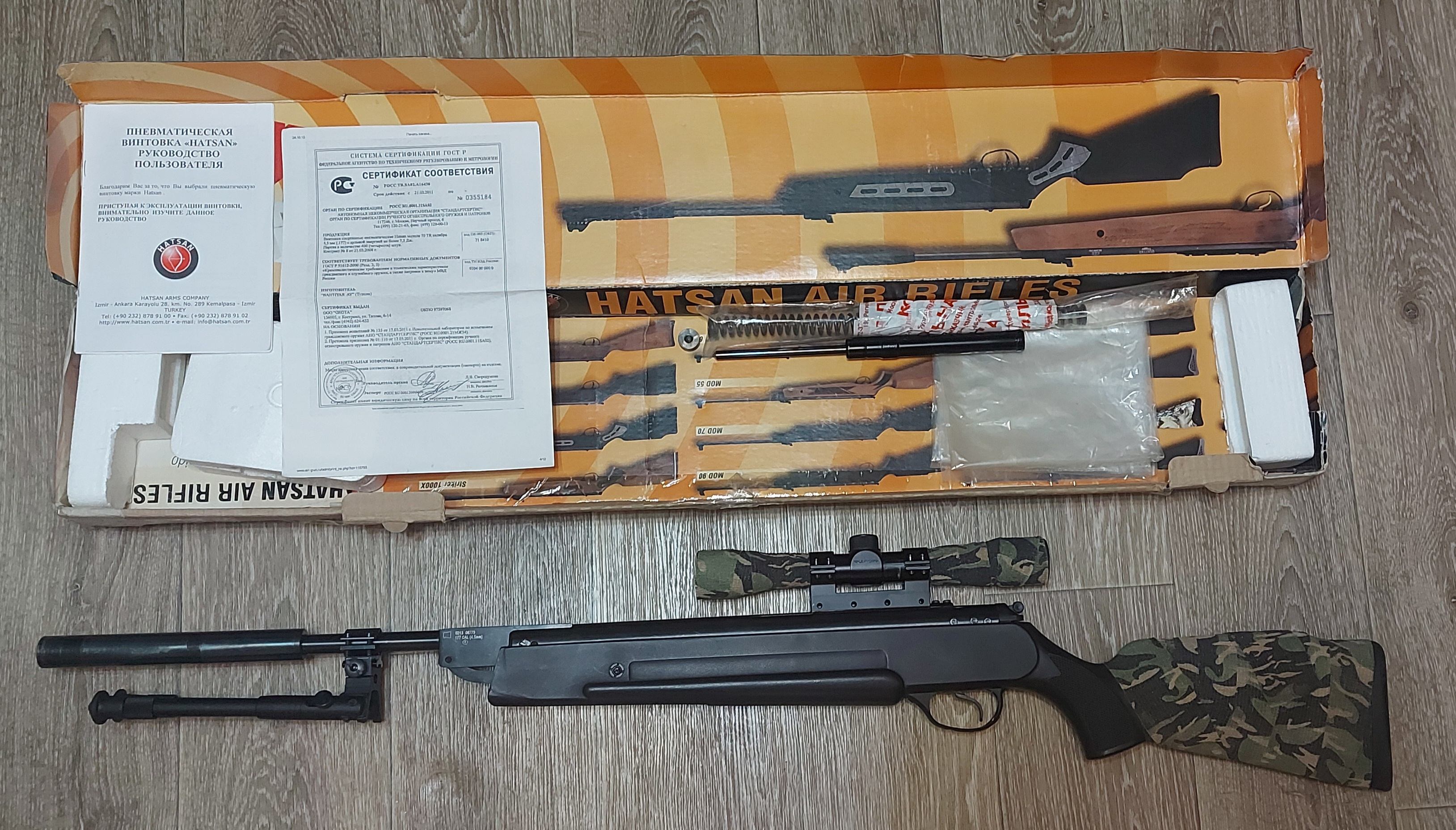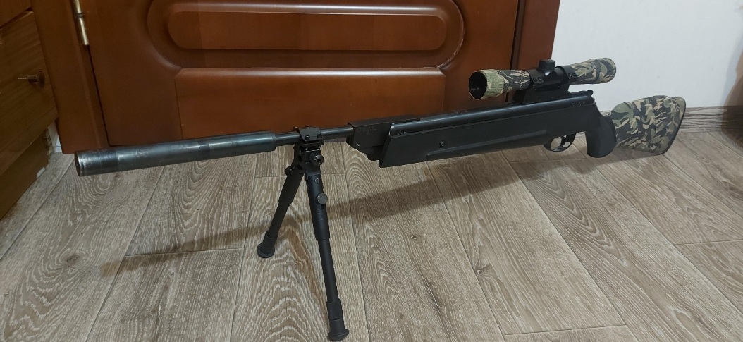 Приклад залит, стоят сошки, надёжный стальной саундмодератор-утяжелитель. Установлена стоковая витая пружина. В комплекте витая усиленная пружина и газовая, которую нужно накачать. Запасная манжета. Документы. В подарок отдам оптику китаец 9 крат отремонтированный, работать работает.