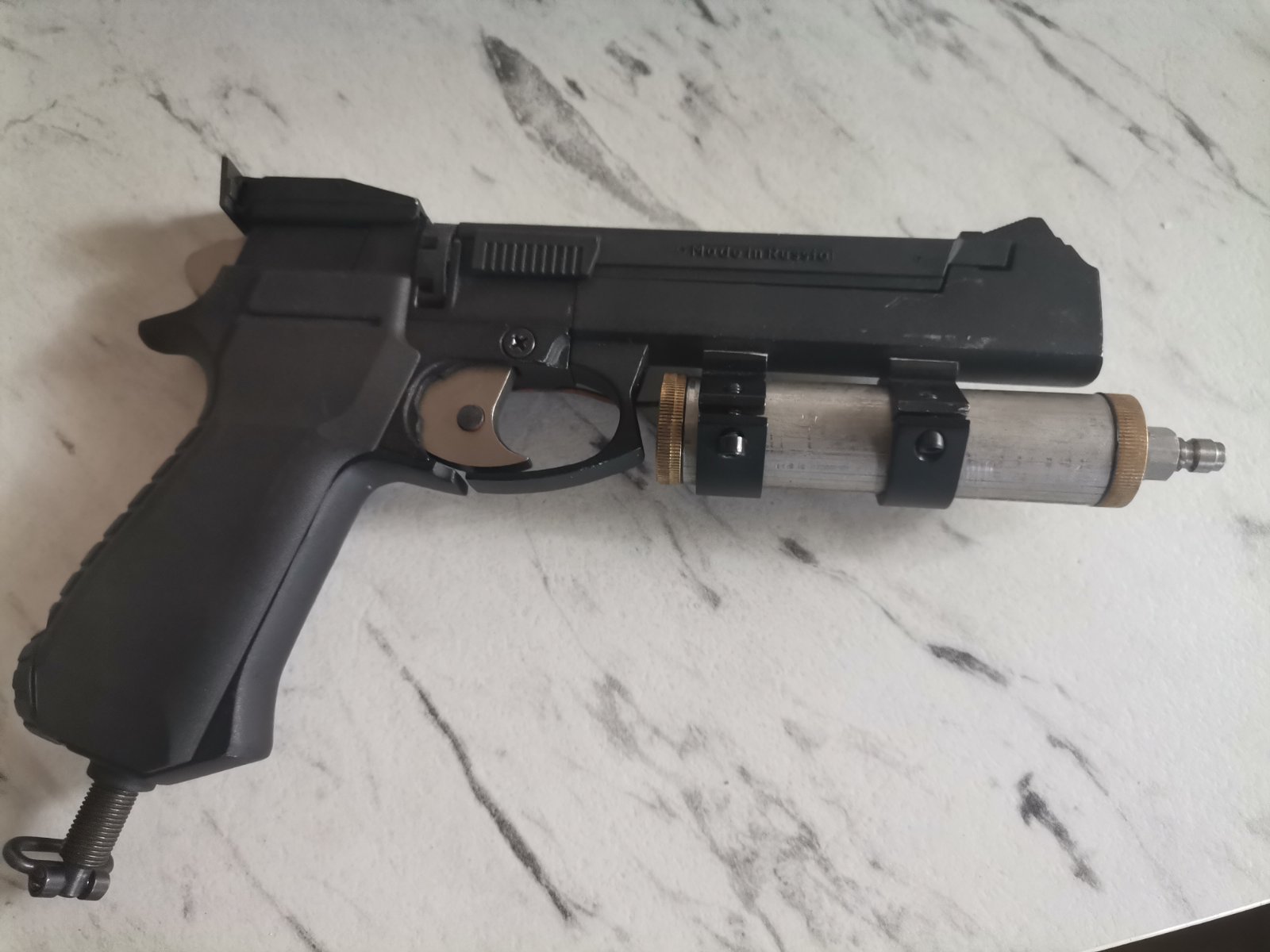 Давненько увидел на просторах интернета такую конструкцию. Только недавно воплотил в жизнь. Заправляется от баллона углекислоты. На сколько выстрелов не знаю. Дофига. Забыл сфоткать заправочный фостер. На втором конце резьба под баллон углекислоты. Можно выточить для заправки от огнетушителя. Т.е. заправляешь 5-литровый огнетушитель, откручиваешь раструб и вкручиваешь фостер. Систему для зарядки шарами снял. Шарами никогда не стрелял. Пулек выстреляно примерно сотня. Можно все вернуть на оригинал, но смысл? Эстетика ни к чему, главное дармовая стрельба. Так думаю. Цену предположу 250 руб.