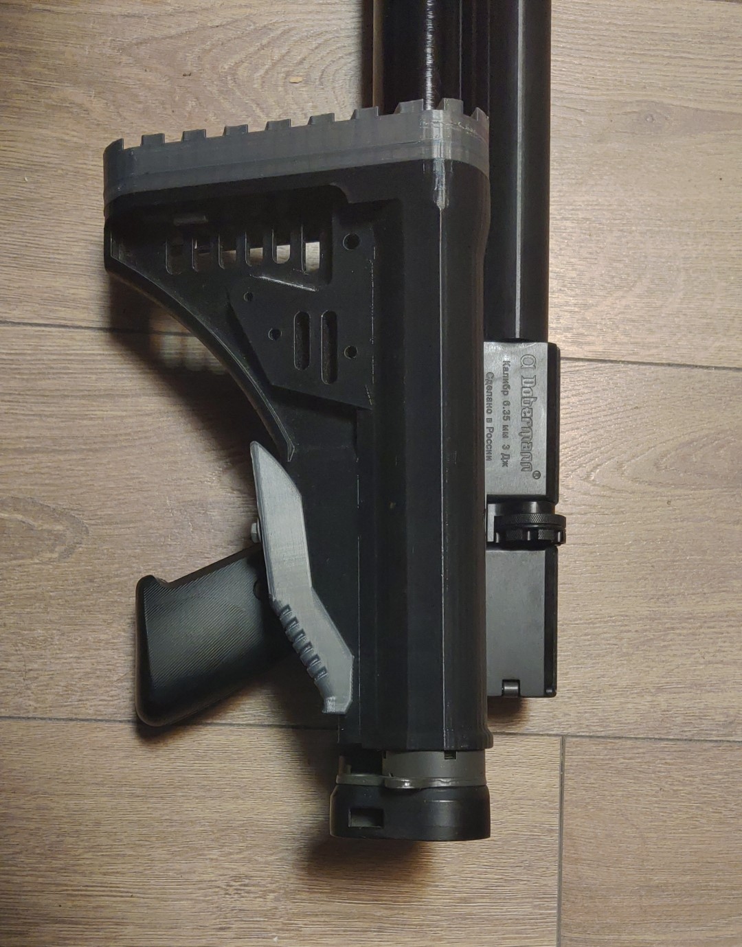 В качестве упора для плеча карабин Доберман укомплектован регулируемым телескопическим прикладом. Изменение длины вылета даёт возможность настроить воздушку под личные параметры роста стрелка, а также вносить изменения габаритов винтовки при смене положения для стрельбы.