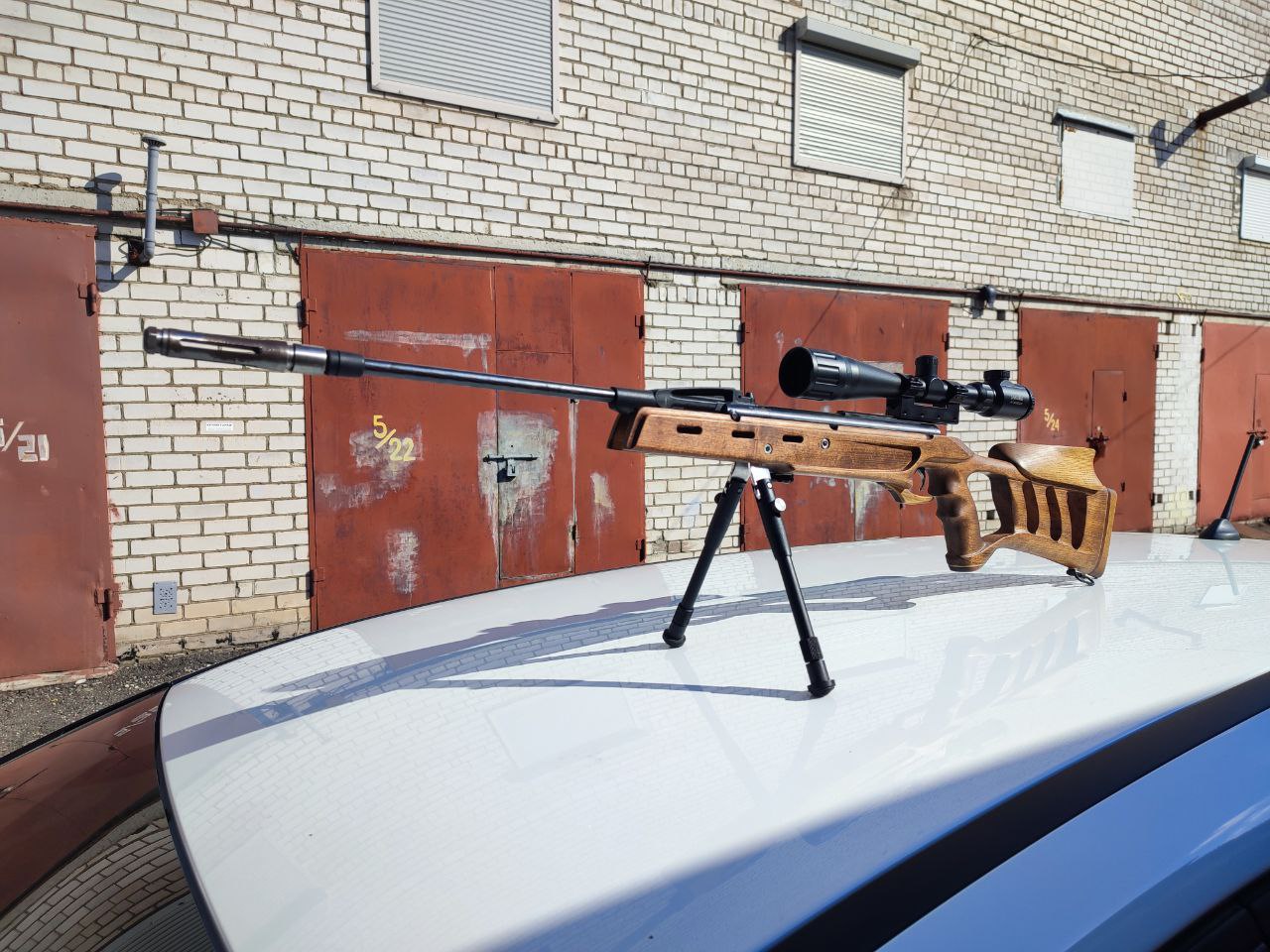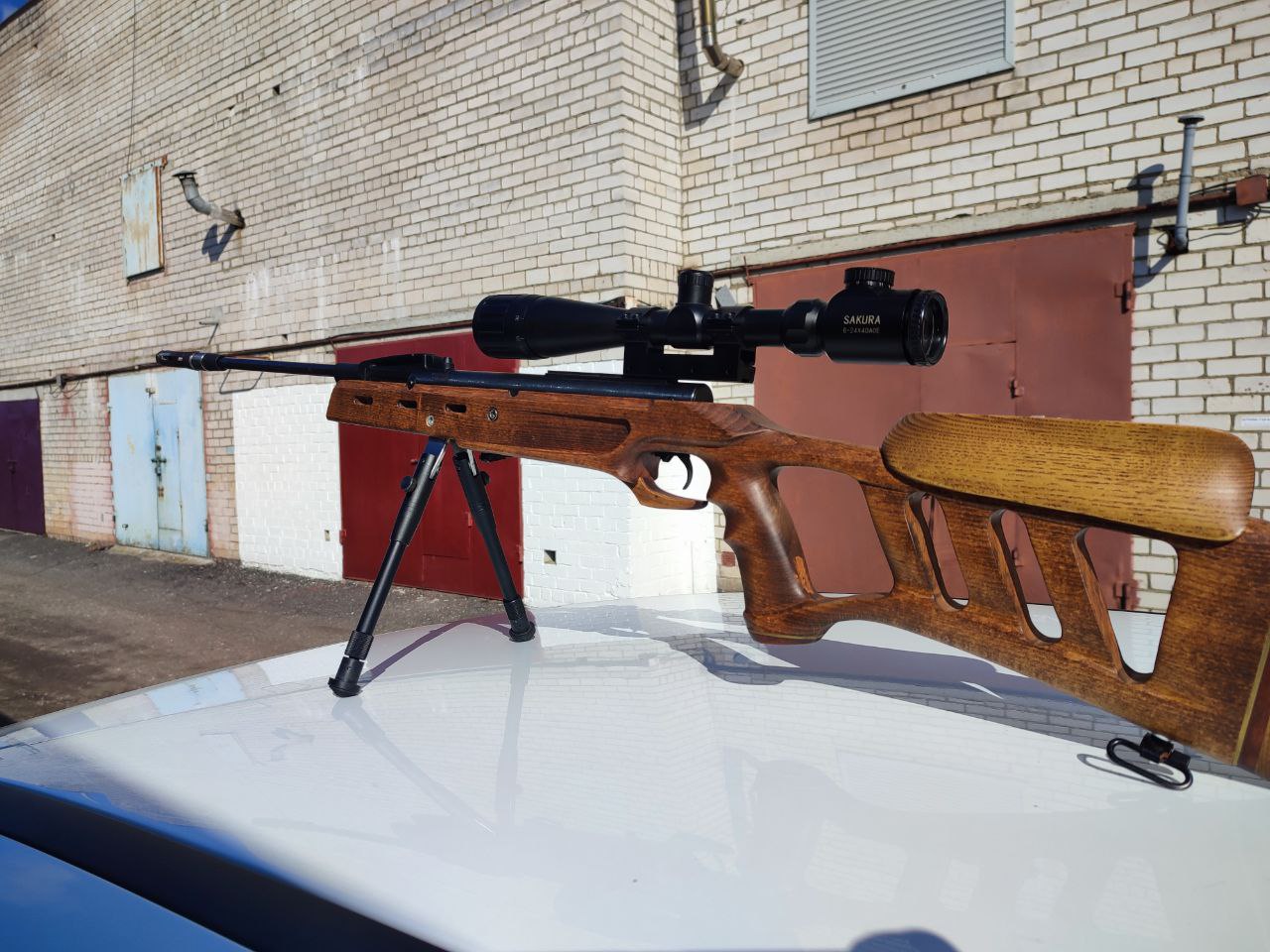 Ложе из бука со вставками ясеня , красного дерева и латуни также установлены антабки для ремня щека под левшу. Прицел Sakura 6-24*40 АОЕ с подсветкой сетки. На ложе установлены сошки, то есть они встроены в ложе, сошки с регулировкой высоты. Установлен надульник. мощность МР 512 до 3 ДЖ. Заменен пере пуск и манжета. Доработан и отполирован УСМ. На стрел около 800 пуль. Цена 750р. +375336950080