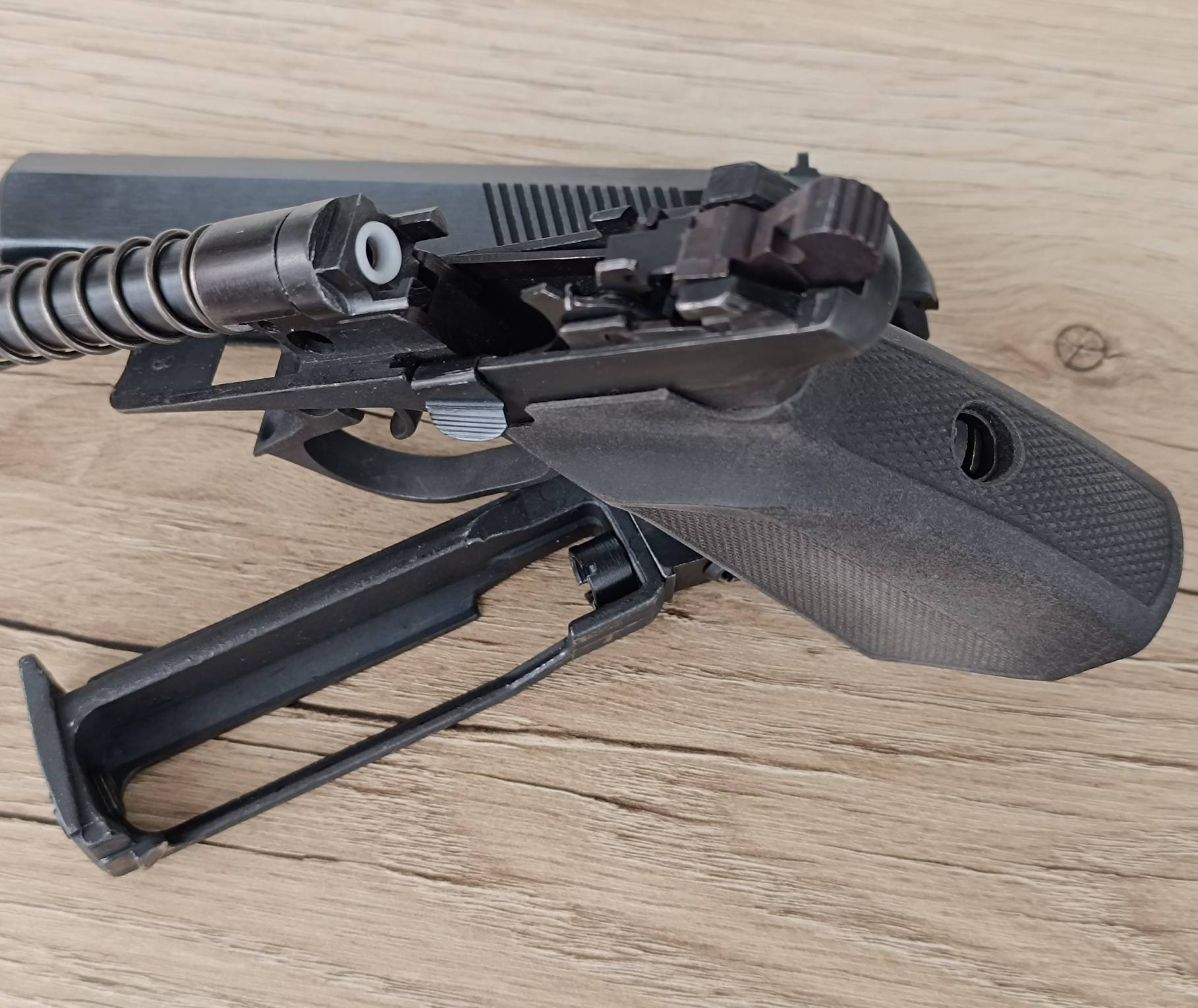 Поставил не пиленый курок и менее частую матовую рукоять. Покупатель сможет выбрать любой вариант рукояти. Вплоть до оригинальной ортопедической коричневой.