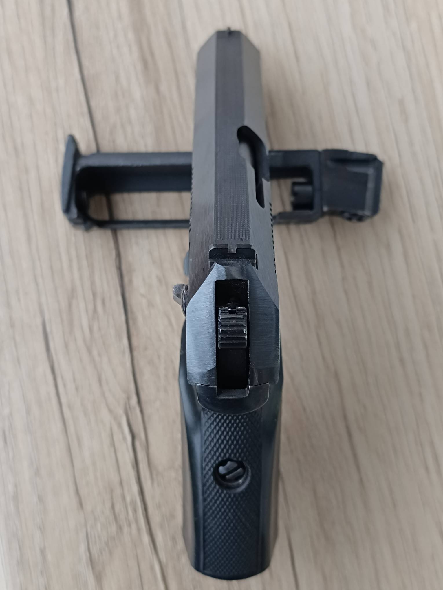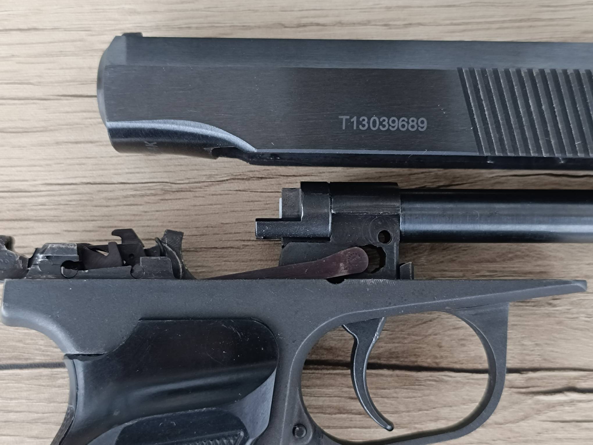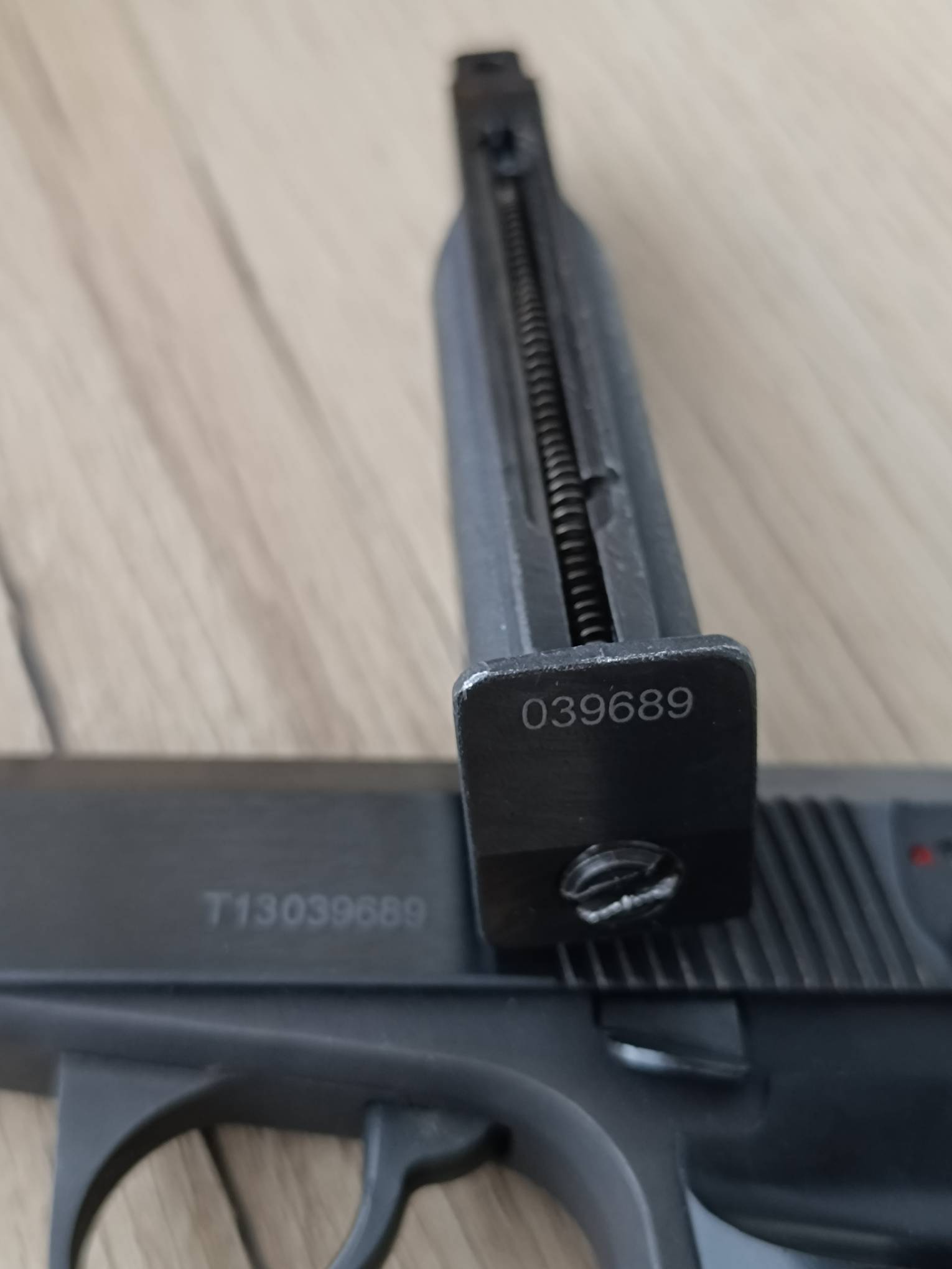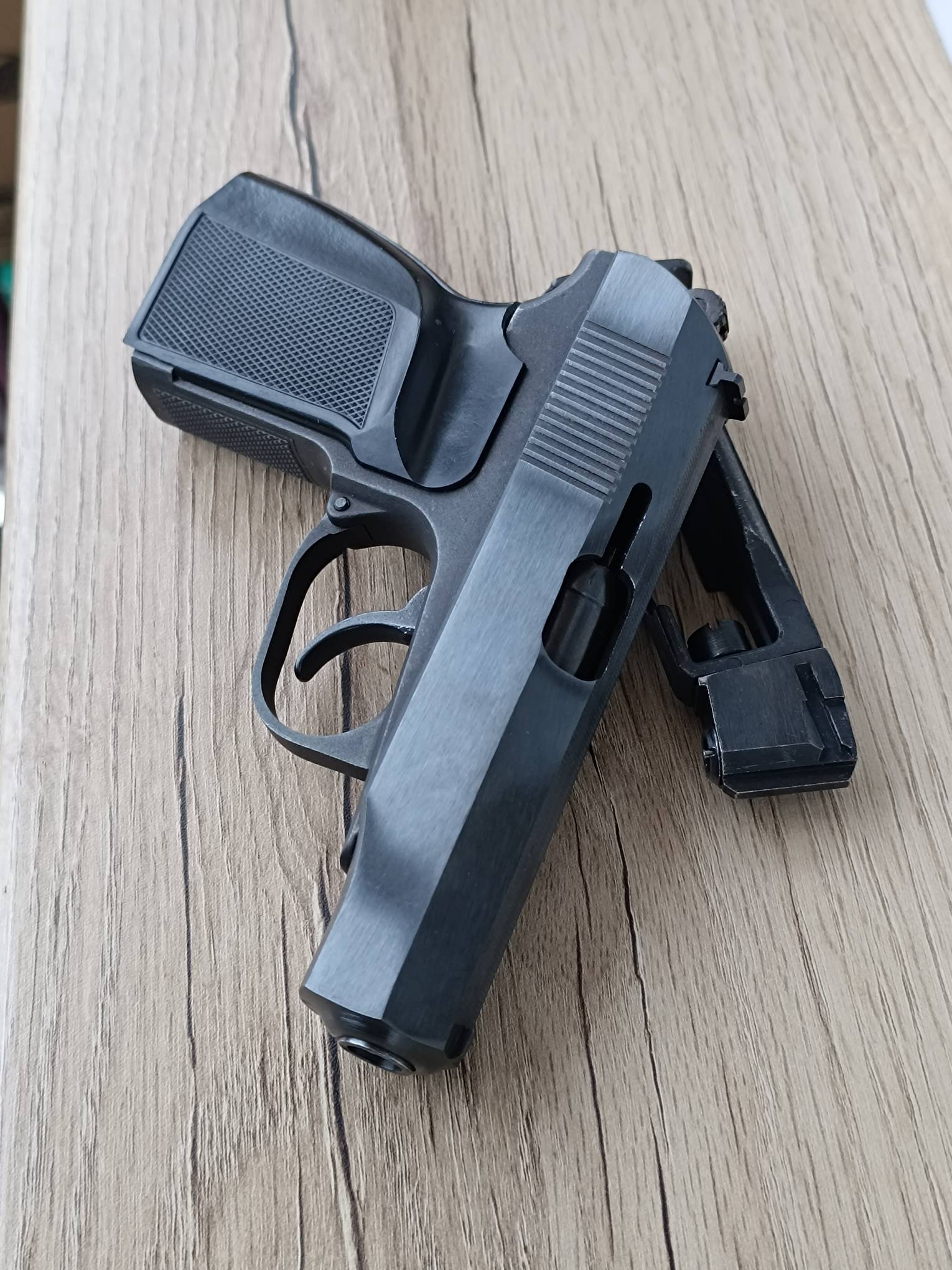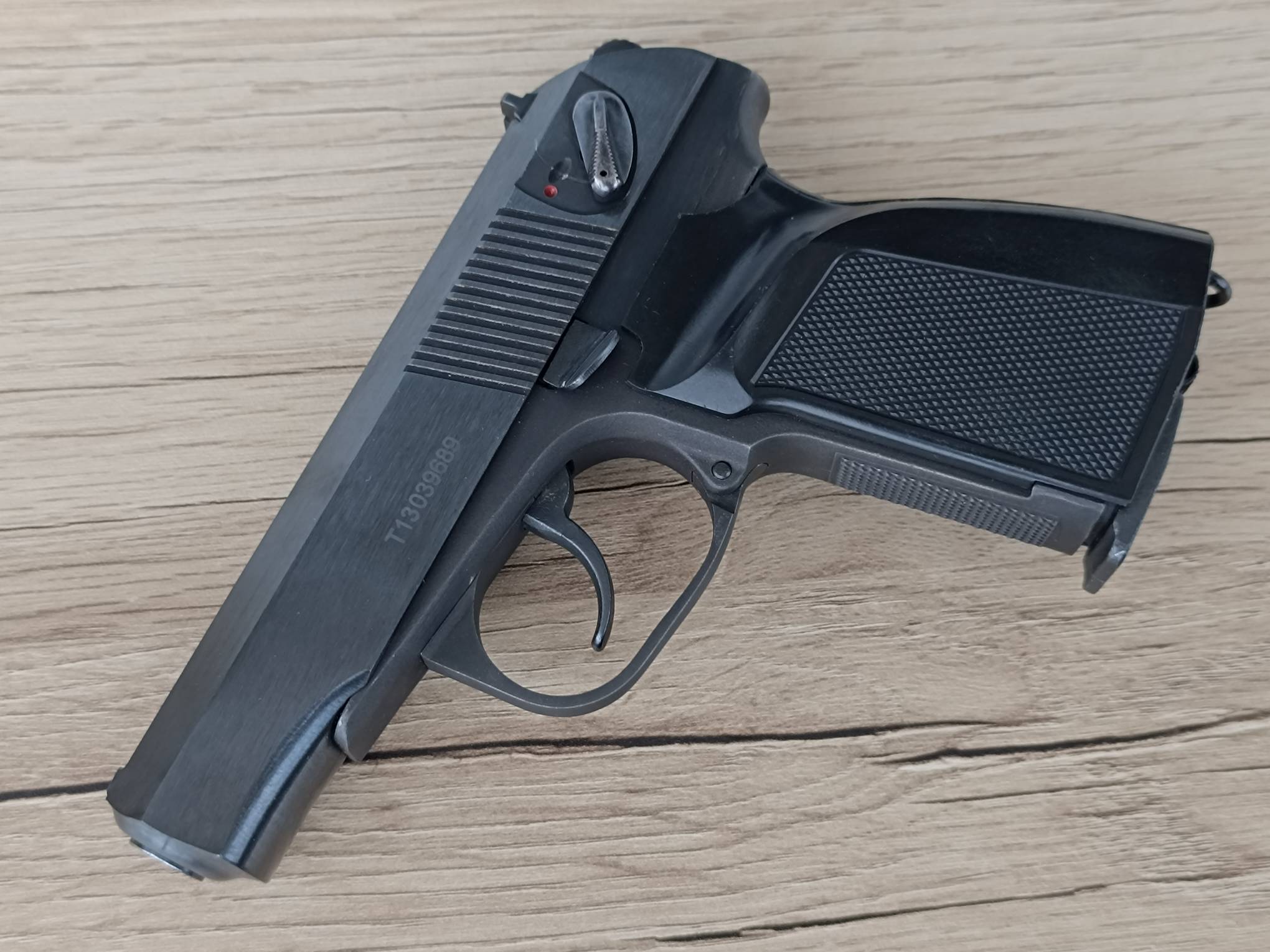 МР-654к ПММ. Полочник. Первый массовый выпуск 2013 года, 311-я серия. Установлена ранняя пммовская рамка с мелкой насечкой. Гладкий стволик, круглая гайка с фторопластовой прокладкой, правильная задвижка боевой пружины с насечками, не пиленый курок. Рукоять глянцевая или матовая на выбор покупателя. Полный комплект ( пистолет, зип, ключ, паспорт).