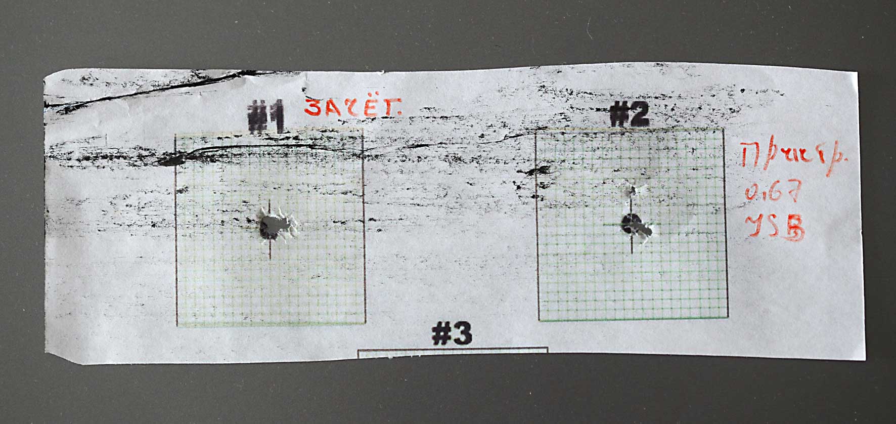 Там где-то была моя мишенька в клеточку 1Х1 см. Это кучки до отстройки скорости, а после отстройки в 12-14мм вложил 5 пуль СР 10,5. Так что то что на фото средненький , я бы даже сказал "сырой" результат. А JSB из нее не очень)))