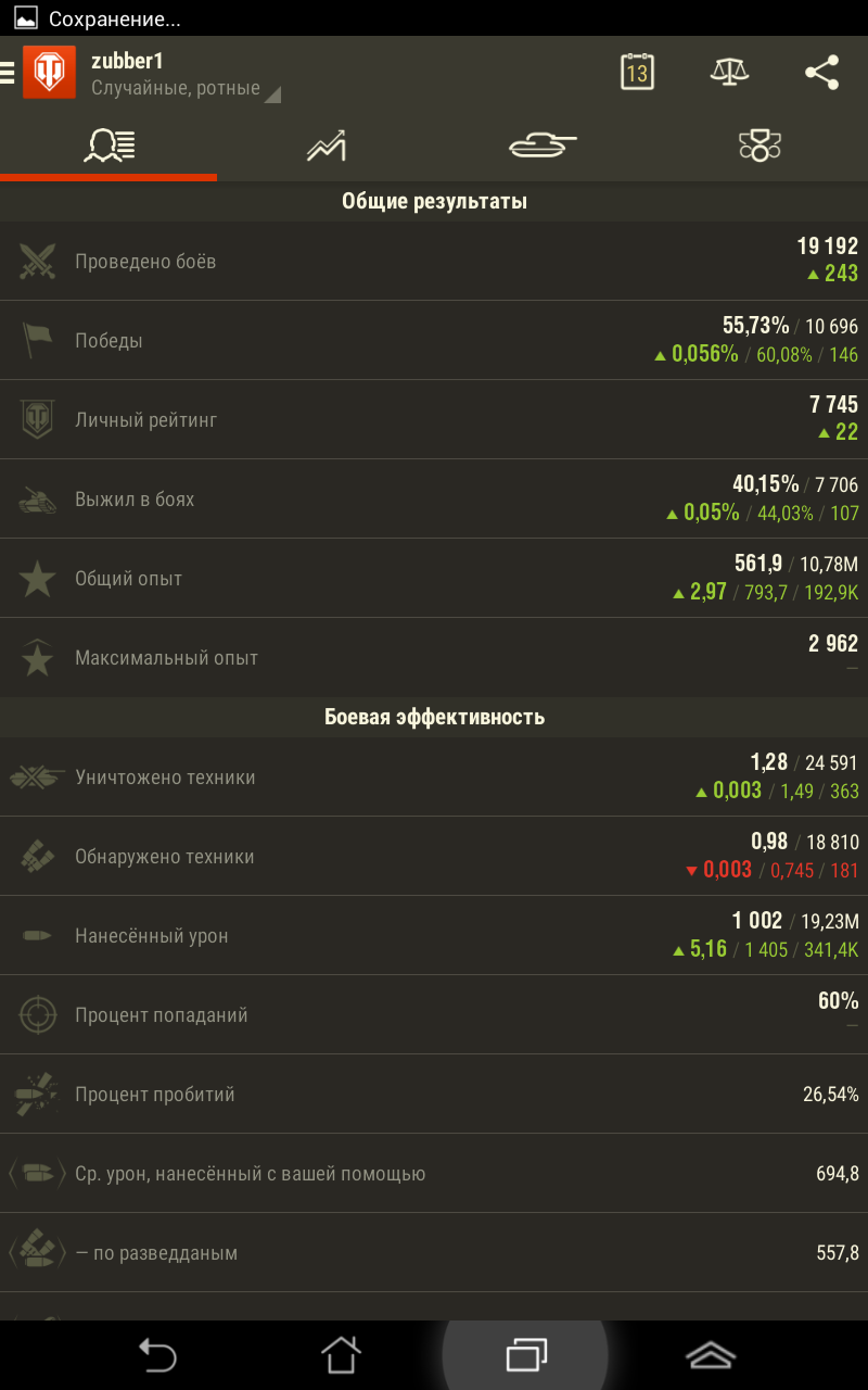 Пришлось сегодня реабилитироваться... Разок с утреца, и разок в обед... Простила. Говорит что к тем вещам что ненавидела до сих пор , теперь прочно добавились ''танчики''. А так, погоняли неплохо. Первый скрин нас было еще трое, на втором мы уже вдвоем с ''дж. Бондом'' продолжили веселуху ... наверно до самого утра.. По мере ''протрезвления'' повышался и процент побед... Статистика ''асистанта'' обнуляется где то в 2 или 3 часа ночи.. так что там на нижнем скрине это видимо как раз и когда уже остались вдвоем.