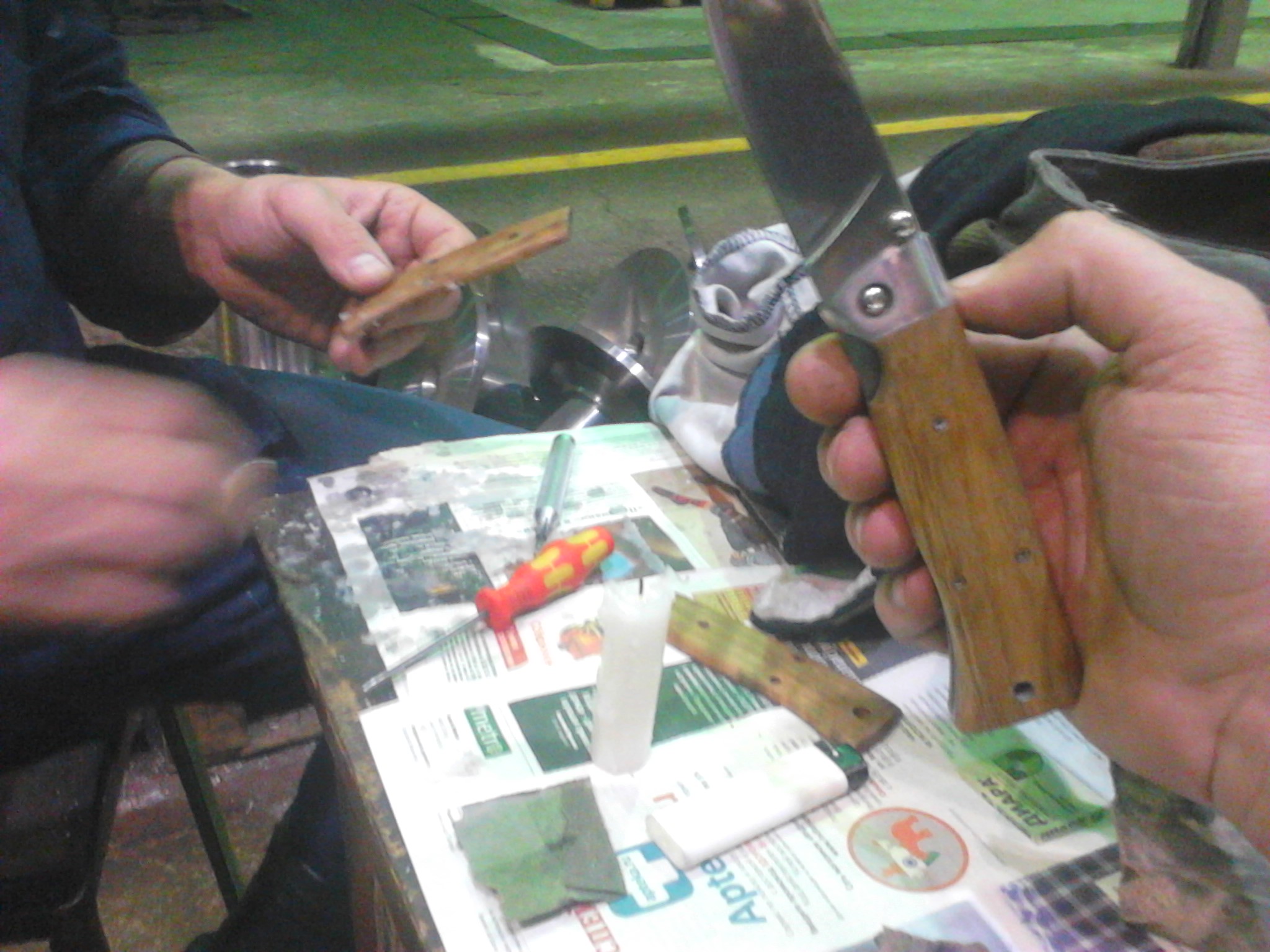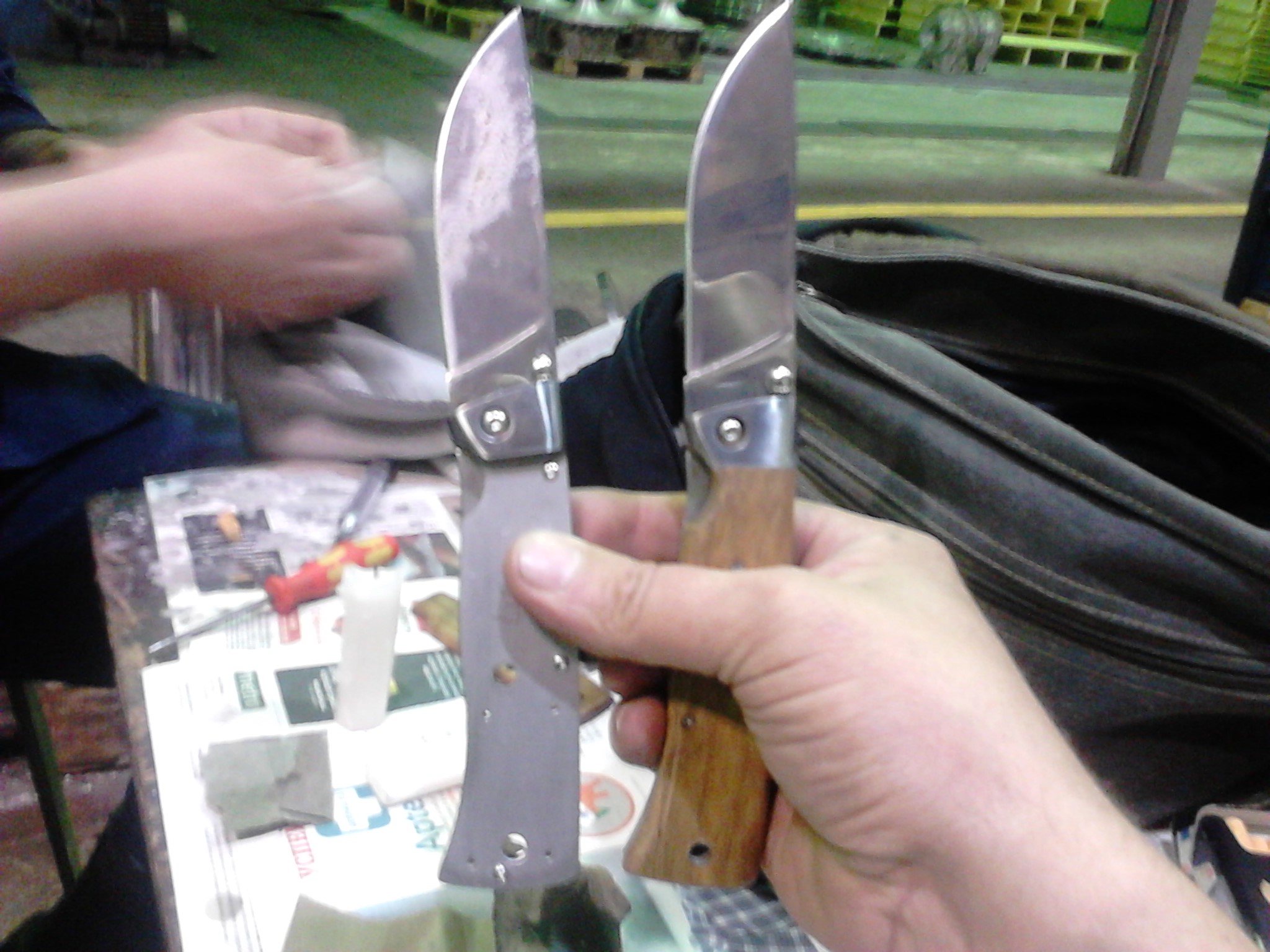 Сегодня занялся своим ''Стерхом''. Разобрал. Скруглил все острые кромки по внутренним граням в металлических стенках ручки. Доработал ореховые деревянные накладки нулевкой. Потом пропитал их воском свечи. Теперь все надежно. Не напитается ни водой, ни грязью. Вердикт... сделан надежно. Лезвие как и предпологалось не кованое , а просто вырубленое штампом из листа металла. Потом видимо калилось в ''соляной'' ванне. Возможно что по кромке присутствует и некая зонная закалка. Так как сам обух лезвия по ощущениям мягче чем кромка. Все что сделано машиной, обработано точно и красиво. А вот где прикоснулась ''рука поэта'', дагестанского сборщика ( а может и таджика гостарбайтера), множество мелких огрехов. В местах где подгонялась защелка особенно. Ну и по дереву рукояти во многих местах присутствовали ''полигоны'' от наждака. Все пришлось скруглить, заполировать и оккультурить. Осталось ''грамотно'' подточить, так как заводская заточка легко бреет волосы на руке, но традиционно не имея ''микропилы'' по кромке , мягкие тянущиеся элементы режет ''не весьма''.Местный коллега насмотревшись тоже принялся доводить свой нож. Руки и у него зачесались.... Теперь счастлив. :-)