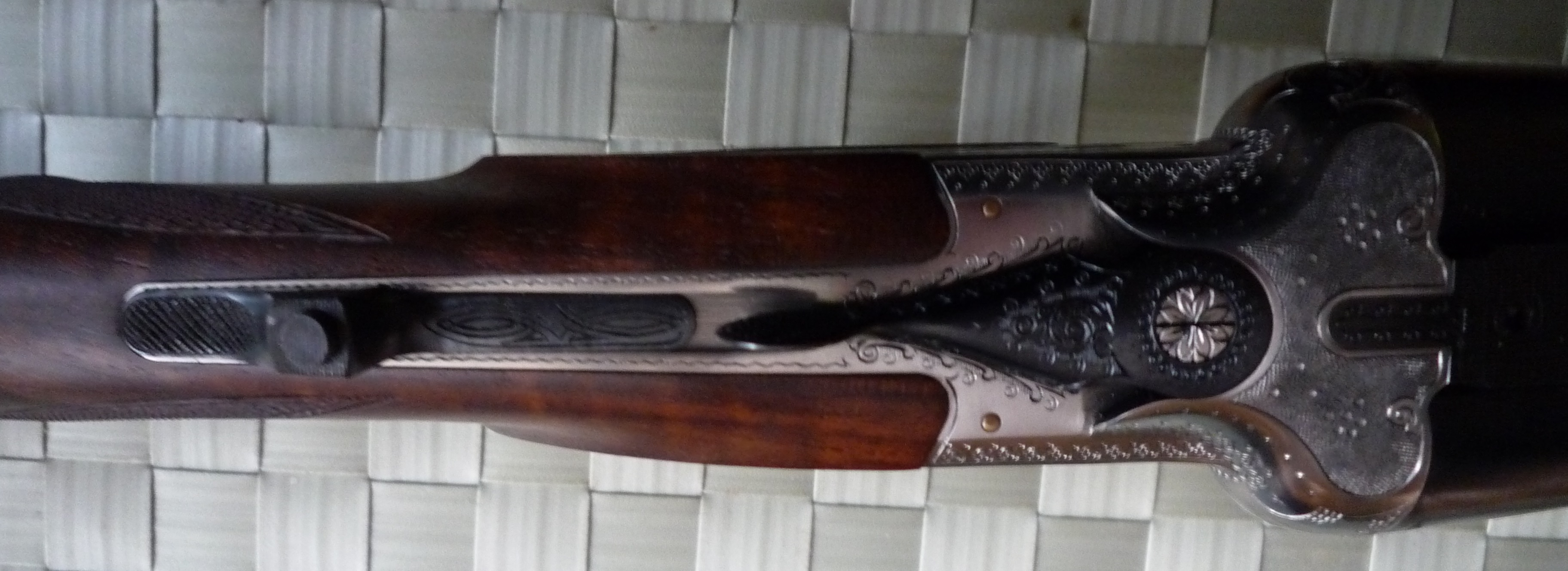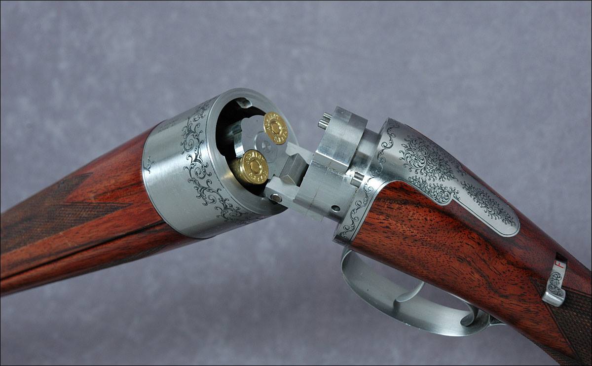 Революционным техническим решением, обусловившим идеальные формы «переломки», стал новый принцип запирания. Чтобы раскрыть ружьё, нужно повернуть стволы, держа их, разумеется, за «цевьё», по часовой стрелке на 90 градусов. В этот момент запирающие упоры выйдут из пазов соединительной муфты, стволы принудительно отожмутся вперёд и под собственной тяжестью опустятся, повернувшись на поперечной оси. Закрывание производится в обратном порядке. Как видите, при раскрытом ружье ось шарнира занимает горизонтальное положение, а при закрытом - вертикальное. В момент выстрела шарнир полностью разгружен: сила давления пороховых газов передаётся щитку затвора, а сила инерции стволов воздействует на массивные запирающие упоры в противоположном направлении. Таким образом, затворная система вертикалки работает на сжатие, а не на растяжение.