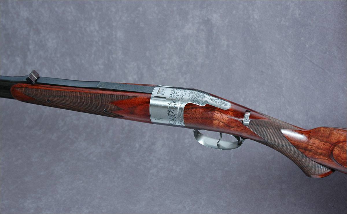 Как известно, тела вращения - извечный символ совершенства и прочности, притягательный образ идеального. В ноябре 1995 г. Д.Хёниг завершил многолетнюю работу над вертикалкой с коробкой и соединительной муфтой роторного типа. Коробка ружья состоит из двух частей: корпуса и поворотного затвора с салазками (фото 5 с рисунком). Муфта представляет собой цилиндрическое стальное тело, в его передней части закреплены стволы, а в задней имеются соединительный продольный паз и выемки под запирающие упоры. Собственно цевья, в строгом понимании этого слова, нет. Его заменяют боковые деревянные накладки, которые крепятся винтами к ствольному блоку. Коробка соединяется со стволами посредством салазок, которые задвигаются в паз муфты и фиксируются защёлкой.