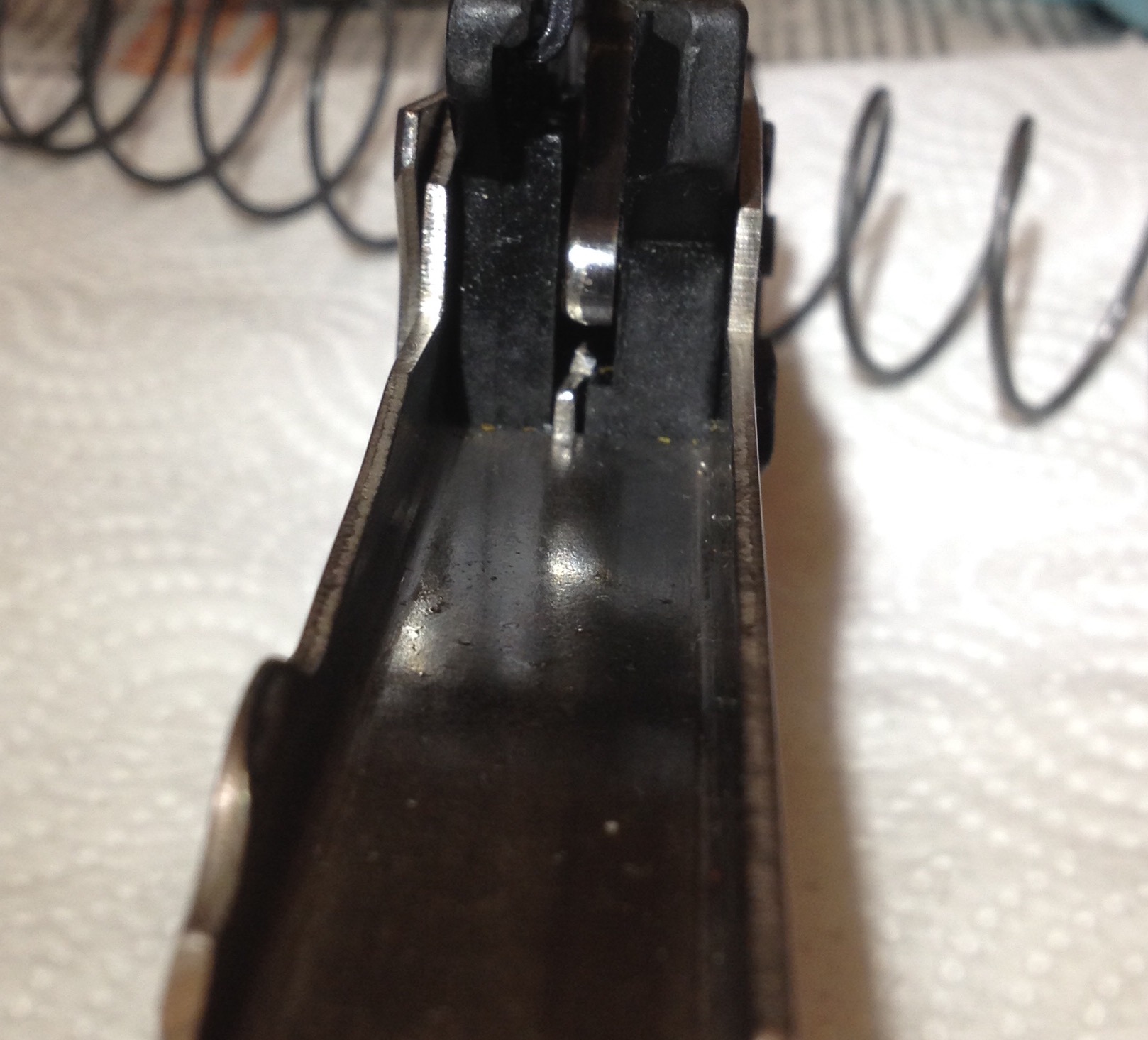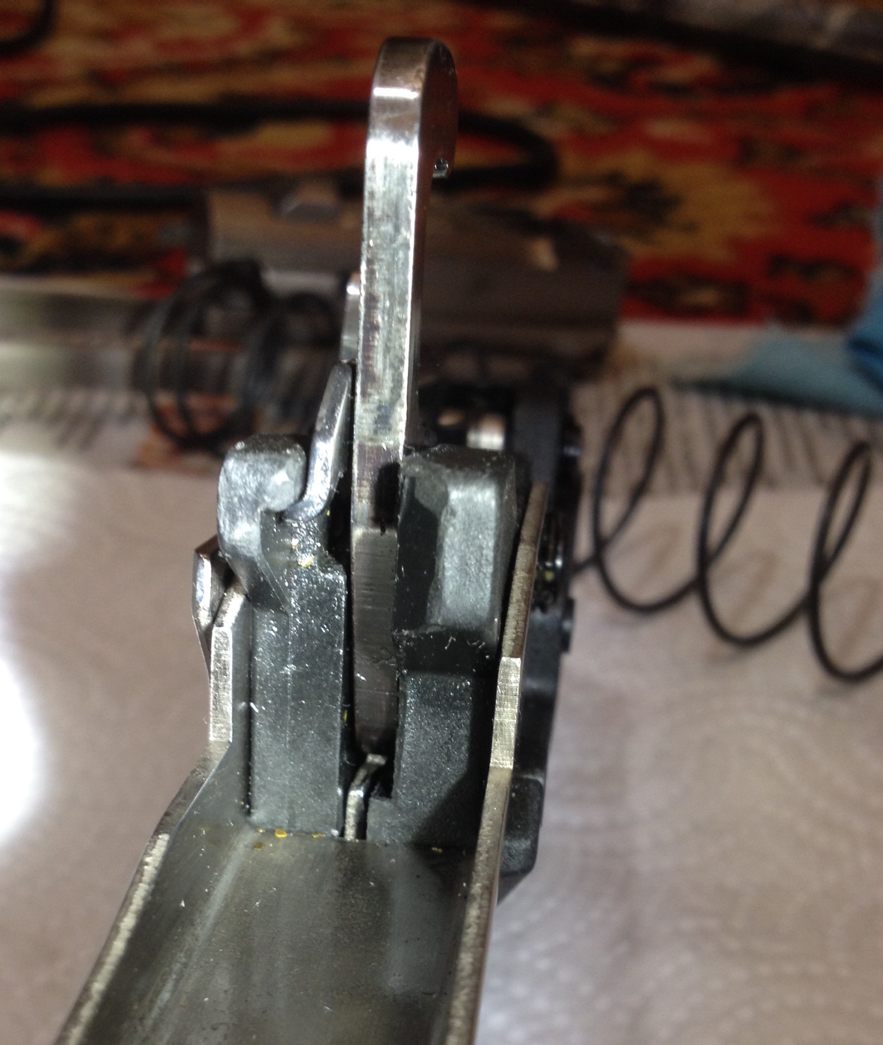 Я не правильно пояснил, зарядил ружьё, после чего разрядил путем передергивания затвора, так вот при выбрасывании патрона с казенника, другой должен зарядится из лотка, но лапка лотка не много опаздывает, притормаживает и не досылает патрон, а затвор уже возвращается и получается клинит патрон. Так же обратил внимание, что когда передергиваешь затвор а другой рукой помогаешь, т. е. дотрагиваешся до лапки лотка, все работает, затвор успевает захватить патрон и дослать его в казеннник. Сегодня снял УСМ смотрел что может мешать, и мне кажется нашел, но не знаю как это устранить. На УСМ имеется рычаг, который связан с лапкой подавателя, его поддерживает пружина, при взведении затвора в заднее положение на этот рычаг давит планка затвора, я на рычаге увидел небольшие раковины на месте их соприкосновения , а также когда нажимаешь на этот рычаг он как бы амортизирует без лапки подавателя, а потом только срабатывает сама лапка. Когда стандартные патроны, весом дроби 32 гр они немного короче, поэтому лапка лотка успевает сработать, а когда патрон подлиннее, 66 мм, при возвращении затвора лапка подавателя на доли секунды срабатывает позже патрон застревает на перекос. Всю осень стрелял было нормально, это случилось ну буквально 2-3 охоты назад, грешил на газовый механизм, пытался регулировать гайкой, но не помогло, происходит все тоже самое, Сейчас гайку установил на прежнее место. Сам я в технике не силен, а в субботу на охоту.... все печально. Буду пользоваться только заводскими патронами, но ведь неисправность необходимо устранять.