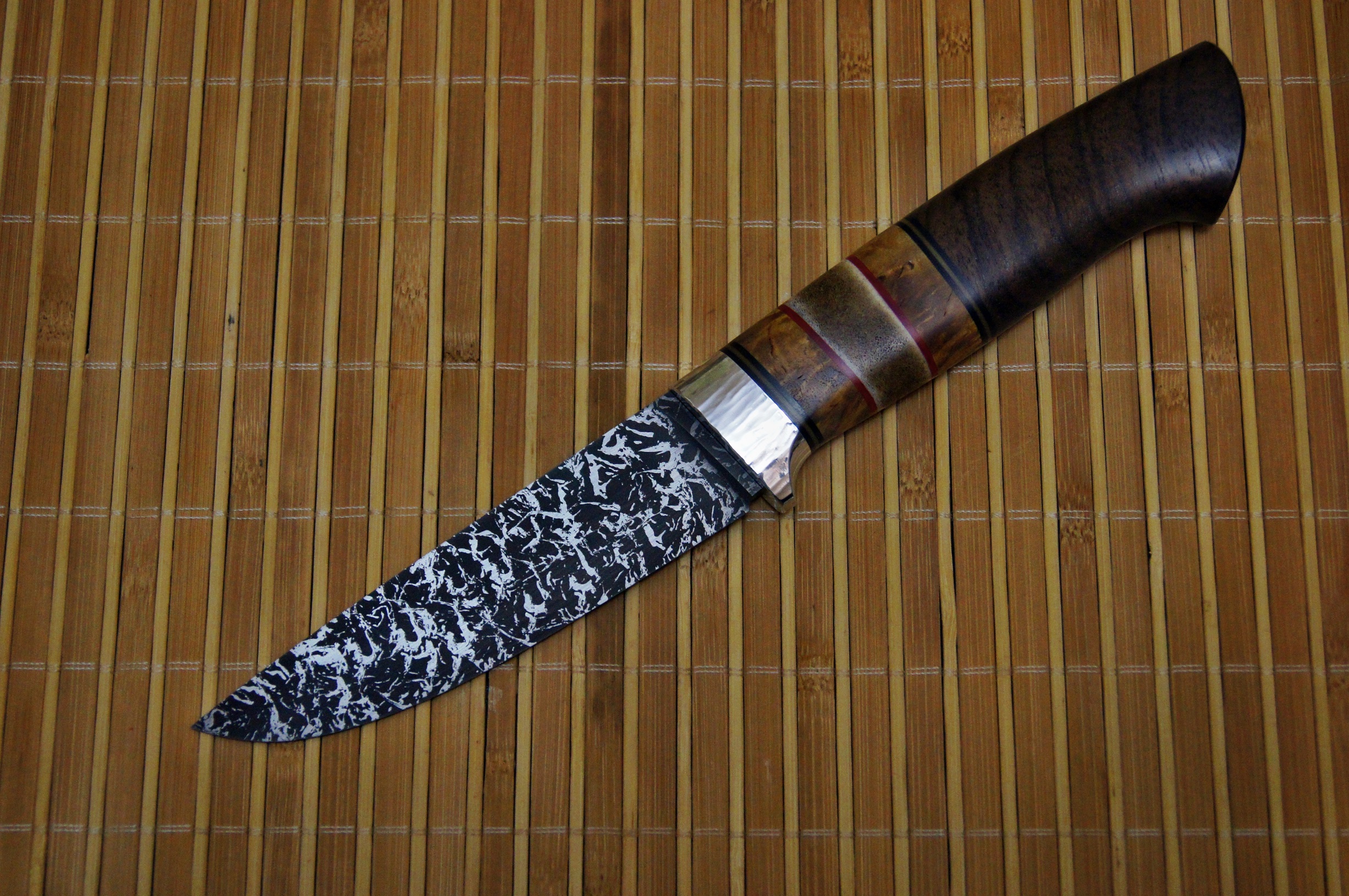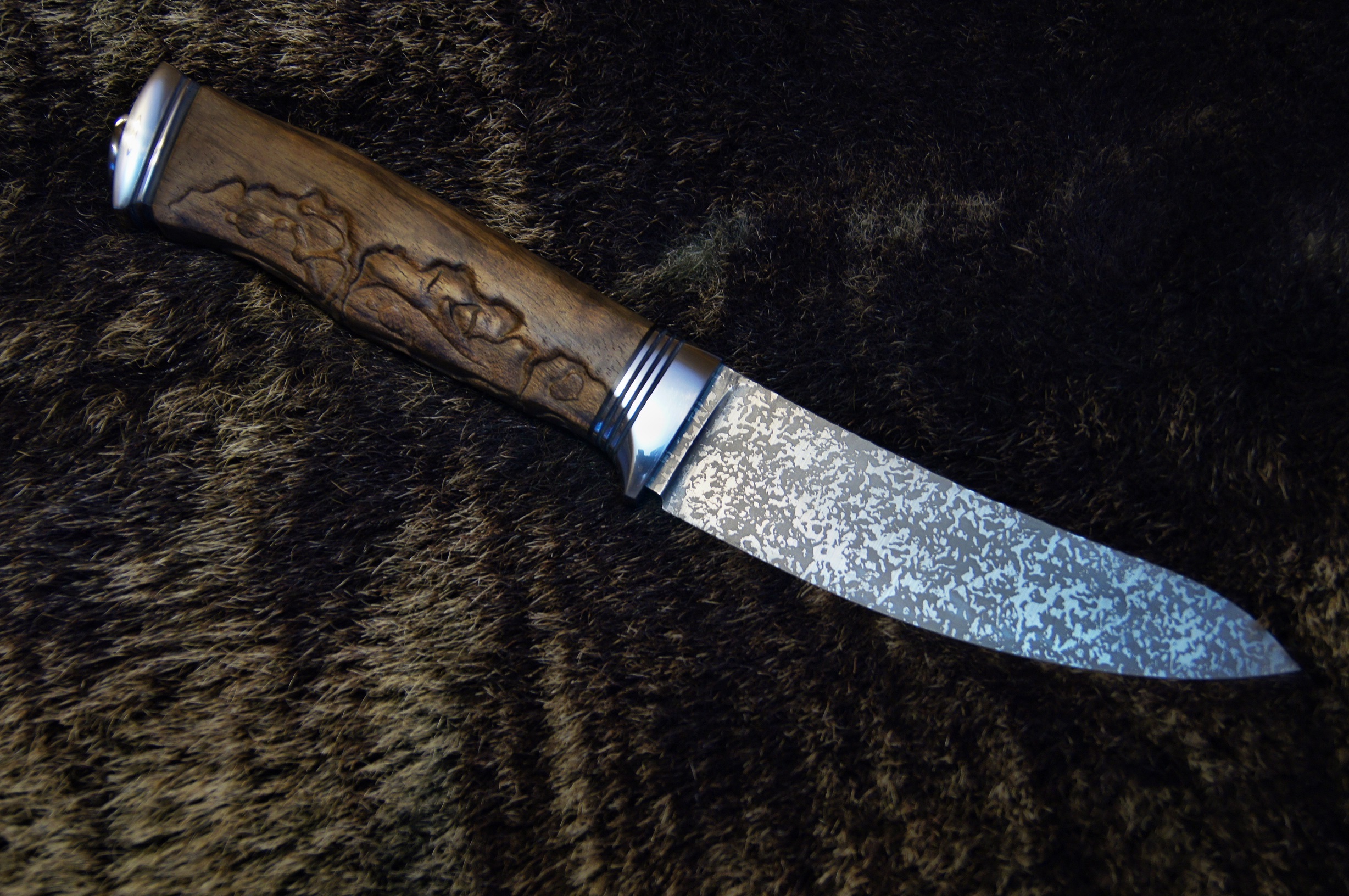 что самое интересное Р6М5 прокатный,молотом не притрагивались.а такие узоры.это я к тому что если кузнец трындит что это благодаря его чудо ковке появляются узоры...не верьте..пиз..ёшь и набивание цены.у меня самый кучерявый узор был на пластине 95х18 отрезанной от огромного слитка отрезной фрезой.