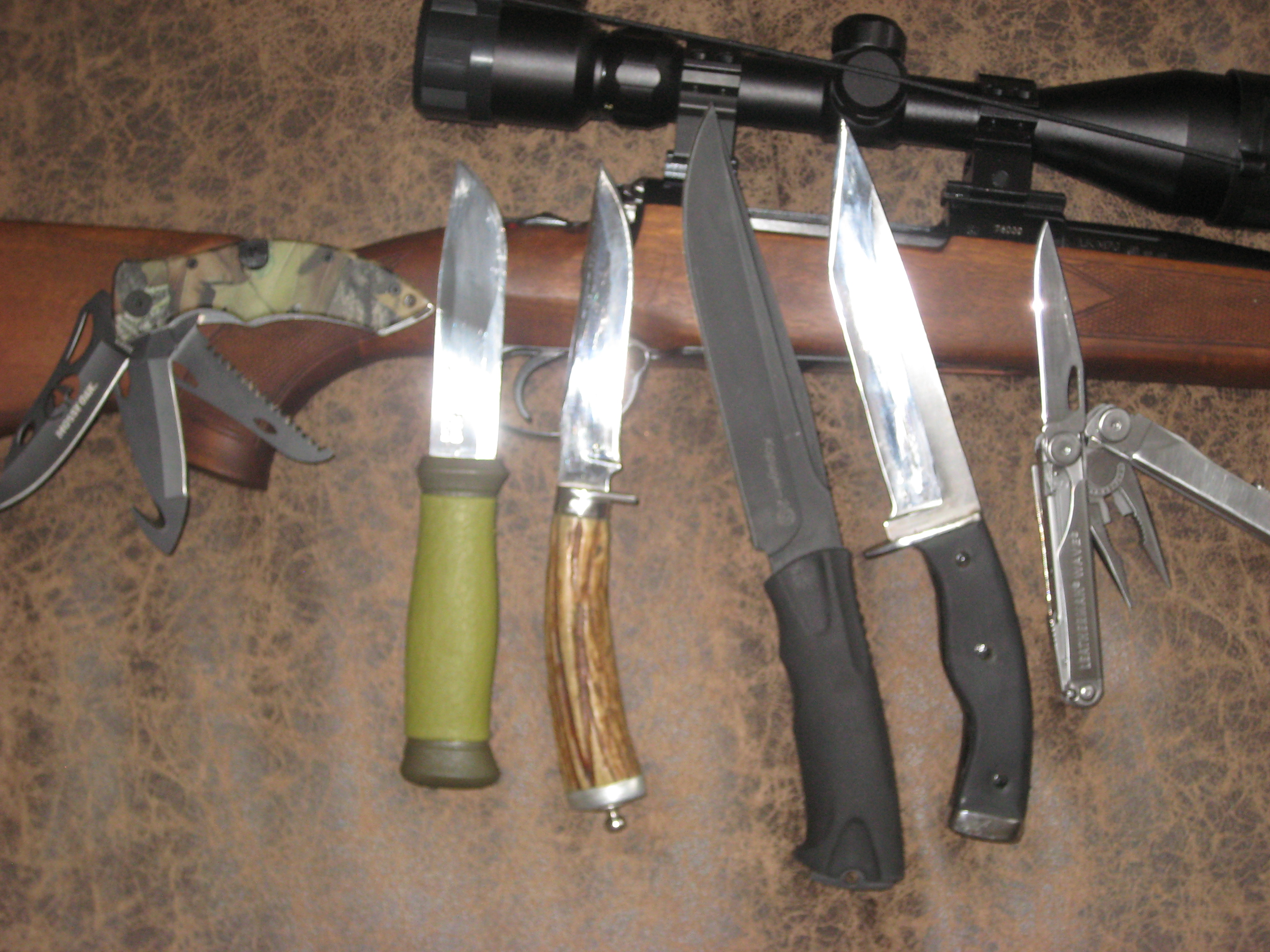 Доброго Всем дня! А и Я пожалуй присоединюсь к теме.Вот парочка Моих с кратким описанием.На фото1 Всем известный швед мора,на мой взгляд очень удачный нож,сам факт того что с ним ходит от мала до велика все народонаселение города Анадырь(это Чукотка),Купил ксате его там в местном охотнике за 7у.е. и был приятно удивлен сколько он стоит в Минске,о многом говорит.Складничек тоже швед,пользую часто краска не слезла царапин нет Сам удивлен :sh_ok: на мой взгляд тоже удачный ножик.Тот что с верху с рукояткой из кости вообще Мой ветеран моя Легенда,разбирал им И лисичку и лосика,ножу уже 17 лет!!! А ОН В СТРОЮ(подарок Отца на 18-ти летие)что за сталь не знаю но рез обалденный и посадить еге нужно оооочень постараться.Фото2 просто ножи которые со мной на работе,отдельно за лизермана,брал его в Лас-Вегасе(США)за 53у.е.модель вейв.в 2006году заточка у ножа с полки можно бриться,часто выручал на работе на охоте да и просто по жизни.В настоящий момент жду заказ 3-для охоты 2-для работы приедут сфотаю и раскажу по подробней.С уважением.