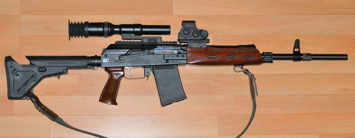 ночной тандем на Сайге20К с парадоксом ( под стволом - лазерная подсветка с длиной волны 850нм, меньшая длина волны уже видна для зверя...при большей длине волны лазерного осветителя не всегда хватает чувствительности ночника для "четкой картинки" ) Не путать с лазерным целеуказателем - вещь НА ОХОТЕ абсолютно бестолковая, вредная и не нужная
