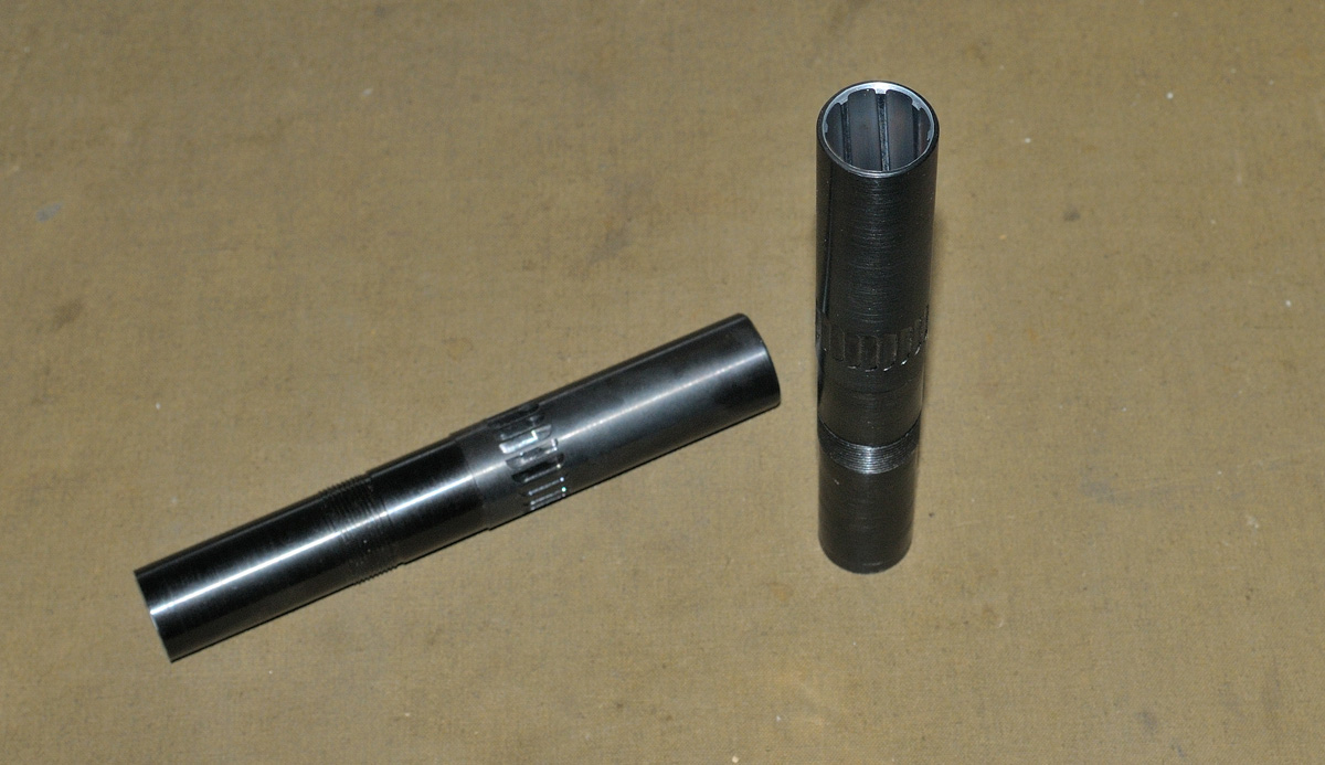 Хромировка ствола остается в первозданном виде - проверено многократной практикой. Подкалиберная СПИ в качественном контейнере тоже уверенно и стабильно закручивается в этом варианте. Следы нарезов хорошо видны на подобранных половинках контейнеров.