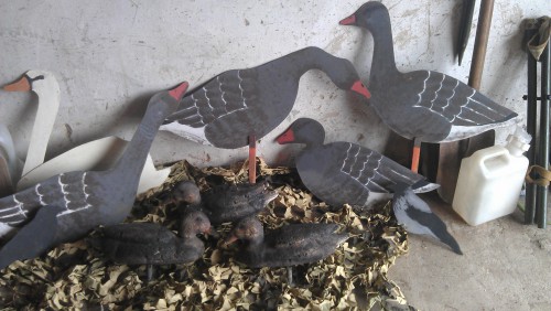 Уважаемые коллеги, разрешите и мне высказать свои соображения в эту тему. Нового я ничего не поведаю, но возможно мои наблюдения смогут быть кому-нибудь полезными. Опыт по гусю я набивал через ноги, как говорят, методом проб и ошибок. В результате кое-какой запас знаний имею. Самое первое, немаловажное-это разведка. Я начинаю прочёску поздней осенью, наношу на карту потенциальные места кормёжки, перепаханную кукурузу, зерновые, стерню. Перед открытием сезона уже при наличии птицы по двое-трое суток по утрам и вечерам ношусь по району в поисках перспективных мест. Убил в хлам подвеску, оторвал бампер, но это того стоит. Вычисляю птицу, веду наблюдение с помощью бинокля зашкерившись, иногда из авто, тщательно записываю в блокнот время прилёта, маршруты, примерное количество. Вижу как они кормятся, выясняют отношения, передвигаются небольшими табунками ровненькими колоннами. Отсюда, кстати, я и стал выставлять профиля почти ровным строем, естественно поворачивая каждый для создания видимости стаи. В течение всего сезона страдаю бессонницей, т.к. этот вид охоты очень обожаю. Постоянно анализирую все свои огрехи, делаю выводы. Использую масксеть 3Х6, лёгкий переносной разборный каркас для скрадка. Время сборки не более 10-ти минут. Профиля, которых у меня (у нас) около 60-тидесяти, манки, причём исключительно сделанные своими руками (около десятка раздарил друзьям), они себя неплохо уже зарекомендовали. Смастерил самодельный леший: отдельно халат (сетчатый овощной мешок, нити из мешковины, льняная верёвка и ещё всякий шмурдяк, независимый головной убор, копыта накрываю мешковиной, обшитой лыком. Фото приведены ниже. Практика показывает, что гузманы идут к профилям, когда они (гузы) ещё не настёганные, причём чем меньше стайка, тем больше шансов. В разгар сезона скрад также провозил в багажнике. Тут самым эффективным оказался леший. Слегка окапываюсь, под задницу лёгкий самодельный трапик, накидываю на него кусок сетки, ну и собственно сам. Под мешковину, которой накрываю ноги вбиваю 4 маленьких колышка, чтобы вопросов по сооружению скрадка не возникало. Лазанием по канавам не занимаюсь из принципа. В таком виде напарник, лежащий в 5-ти метрах уже и сомневается, различает ли он меня. Позиция для стрельбы не самая удобная, но эффект громаден. Тут, главное, найти присадку (профиля могут помешать, но парочку держать при себе необходимо) и маскировка. Все ухищрения пойдут коту под хвост, если разведка срисует стрелка. Малейшее движение, малейший блик и всё, пизнес, если повезёт, то налетит другая стая. Вот они делают первый заход к обосранной ими луже, прямо у нас над головами. Не стрелять шепчу. Напарник аж бзднул от злости, второй круг на присаду, не стрелять, дружище уже чуть не плачет, третий заход, выпускают шасси и чуть ли не на голову начинают садиться. Огонь! 4 особи из сделавших роковую ошибку остались лежать без движения. Вот он кайф! Я их усадил почти к своим ногам. Я готов пожертвовать трофеем, хотя руки очень чешутся, но я вычислил птицу, всё расчитал, перехитрил её. Вот для меня главное. Оружие: 27-й, патроны в стволах разные, контейнер и пыжевой, исключительно самокруты, всё больше склоняюсь к более мелким номерам дроби. К сожалению до сих пор не всегда получается расчитать упреждение, стараюсь стрелять под перо в угон, если повезёт, то на пасадке 