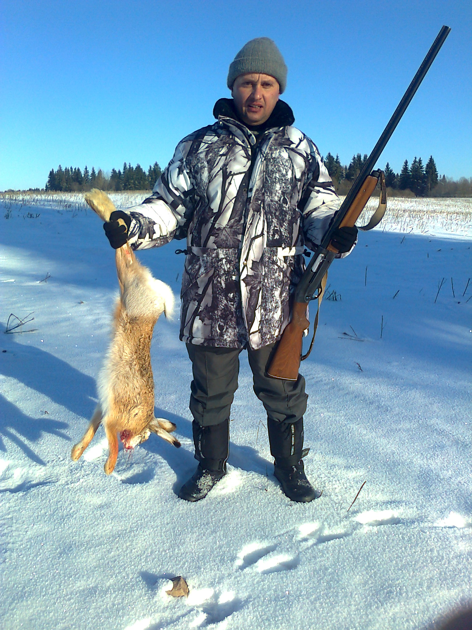 Звал городских хотел им хоть зверя показать за зиму, та куда там .... МОРОЗ говорят, ты чее !!! Пошли своей проверенной братвой, которой все нипочем и ничего не страшно. Снега давно не было - слеееедооовв... Решили загончиками охотить. Вот, похоже, и мой крайний в этом сезоне косой... не пойду на закрытие - жалею зверя в последний день ... амнистия!