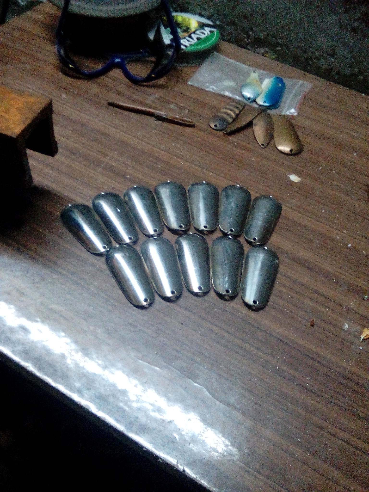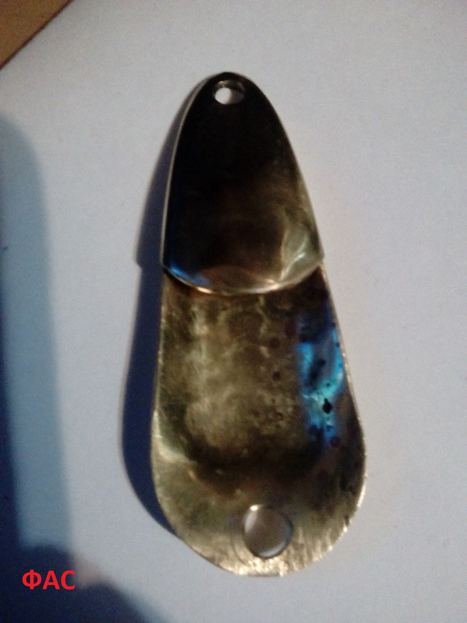 Утяжелял и я колебалки, а точнее переделывал старые советские блёсна под незацепляйки. На фото видно: в том месте, где крепятся усы. Взял свинцовую дробинку большого диаметра и с помощью молотка превратил её в блин. Затем, просверлил дырочку под размер шпильки (шпилька и шайбочка взяты от вытяжной заклёпки) и заклепал. В моём случае утяжеление было необходимо для более правильной игры блесны (чтобы задняя часть не проваливалась при проводке).
