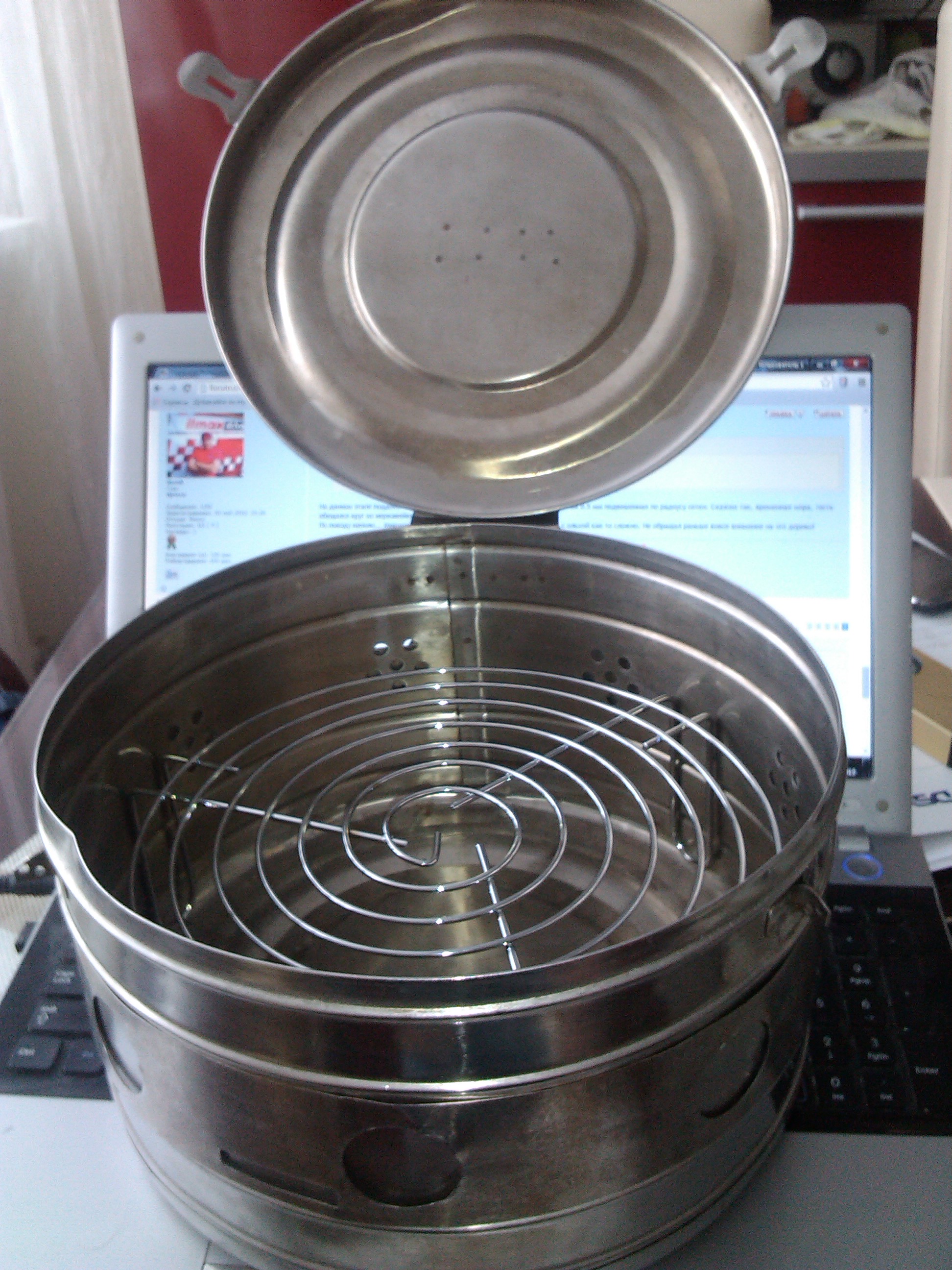 , легкий и места мало занимает. А я по возможности, сырых веточек ольхи или можжевельника добавляю.опилки я немного смачиваю водой перед копчением!