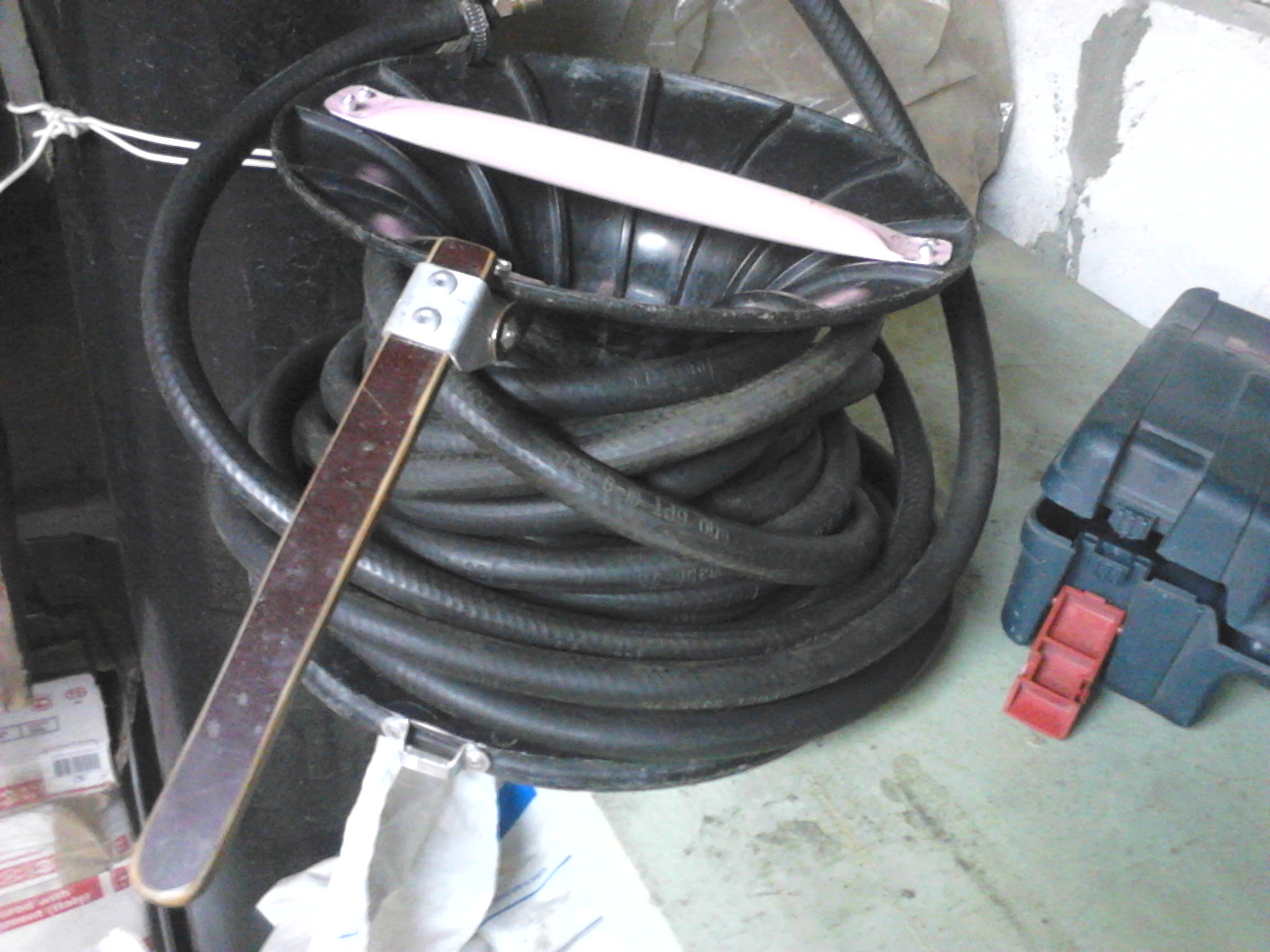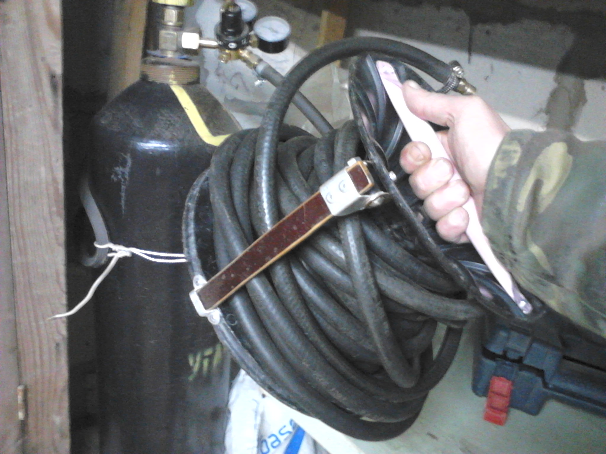 Кроме изготовления кучи шкатулок и последующего "золушкоподобного" перебирания шурупов для ссыпания в отсеки тех самых шкатулок, наконец "поборол" свои 10 метров углекислотного шланга. Так как сварка бывало "путешествует" на всю длину этого шланга, достало разматывать - сматывать его в путающиеся кольца... и как не сворачивай пол полки занимает, а на манометры баллона его вешать тож не весьма правильно.... :st_ruskiy: