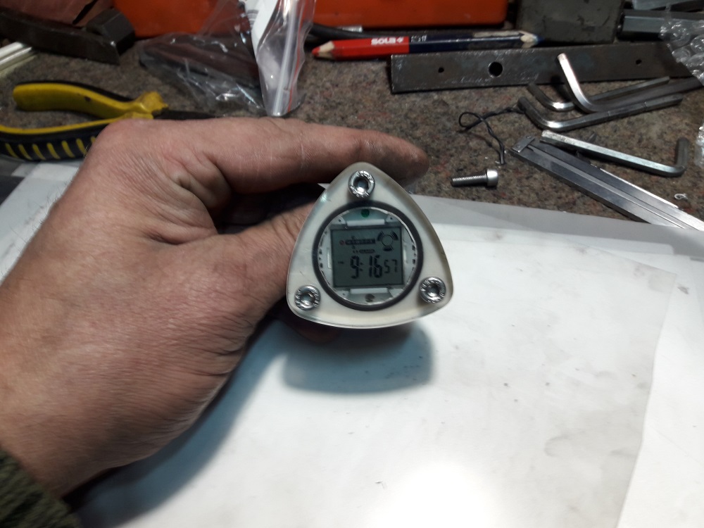 Корпус изготовлен как стакан, вокруг которого установлено резиновое кольцо-уплотнение зажимаемое оргстеклом 6мм.. Заглушку на дисплей, скрывающую корпус самих часов вырезал из пленки от убитой матрицы монитора ноутбука. Что то подкрасил, что то подварил, полирнул болты.