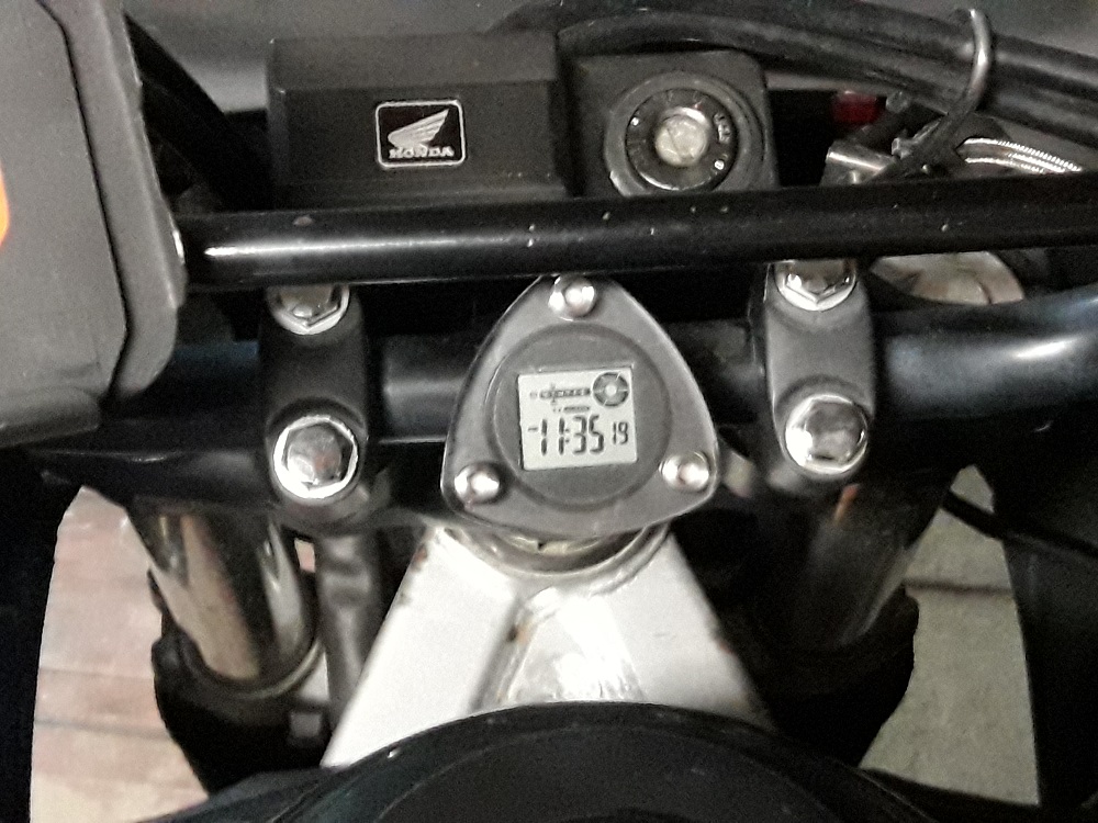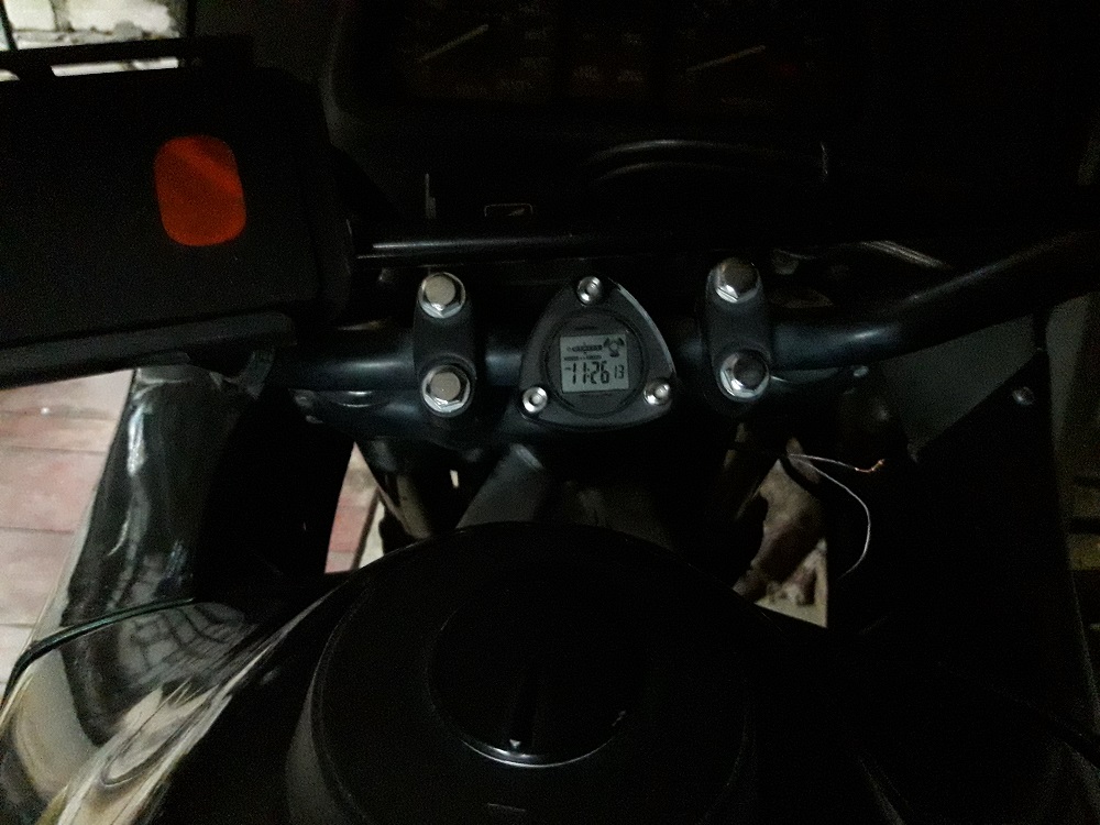 В прошлом году купил на Алиэкспресс дешевенькие мотоциклетные самоклеющиеся и типа водонепроницаемые часики... Приклеил между вилкой и бензобаком. Удобно. Время всегда под носом. ( Cсылка скрыта. Для просмотра необходима регистрация на форуме или войдите на форум. )