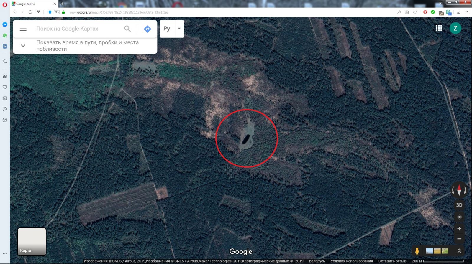 Как то просматривая спутниковые снимки прилегающых к местам раскопок территорий , заметил посреди леса небольшое озерцо.