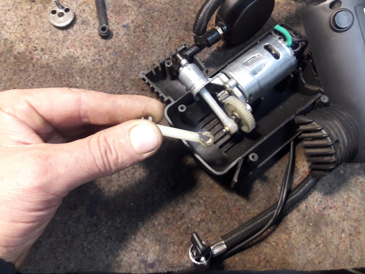 Пришлось изготовить новый шатун, и отверстия в нем и в пластмассовой шестерне что его приводит в движение завтулить бронзовыми втулками.