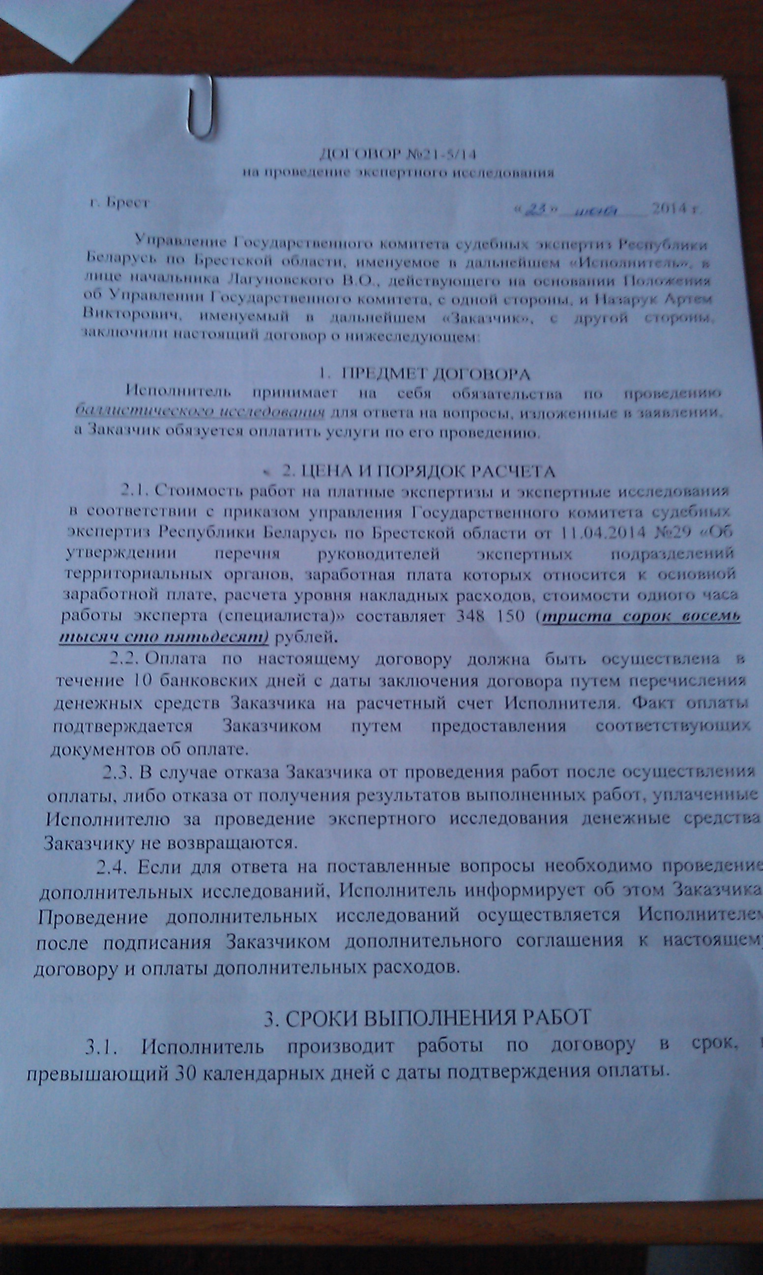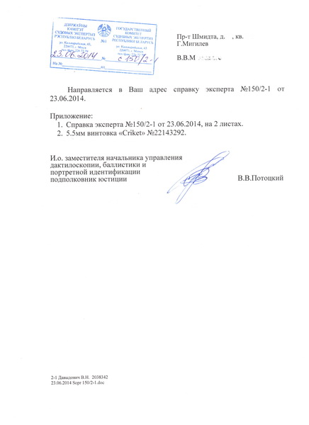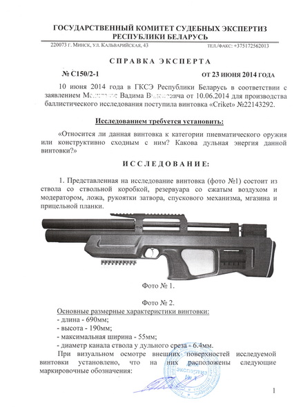 После покупки винт не разгонял, а сразу замерял скорость по заводу, получилось 61м/с или 1.9дж У меня наствольный Хрон-56Т (брал здесь Cсылка скрыта. Для просмотра необходима регистрация на форуме или войдите на форум.) Получил полную уверенность, что винт до 3дж, ну и повёз в баллистическую лабораторию государственного комитета судебных экспертиз которая находится по адресу: г.Минск ул.Кальварийская, 43. Там мне объяснили, что сертификат делать не надо, а достаточно только справки. Дальше, написал заявление на проведение баллистической экспертизы винта. Потом был "удар ниже пояса", по квитанции сумма всех работ составила 1789300р Сказали, пока не оплатишь ничего делать не будем. Пришлось оплатить. Через две недели позвонили и сказали, что можно приезжать забирать. И ещё письмо заказное прислали, заявление выполнено.