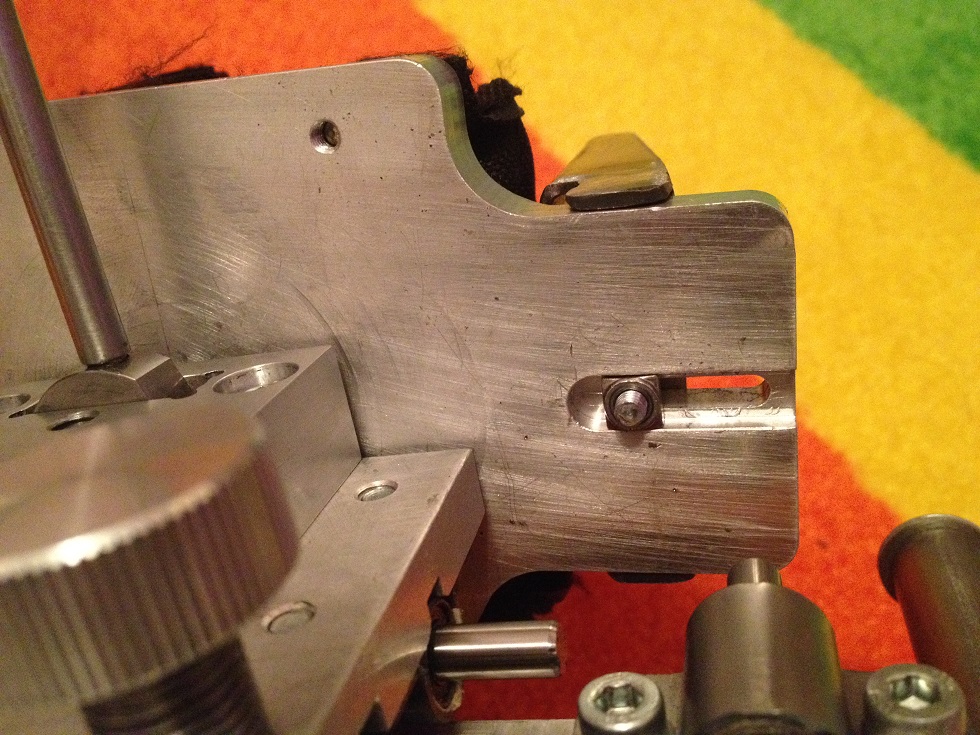 На подвижной пластине имеется два винта для регулировки тормоза. Тормоз нужен чтобы упор не “падал” под собственным весом и весом винтовки, и усилие на рычаге было постоянным на подъёме и опускании (также это достигается регулировкой положения трёх подвижных грузов на противовесе). Бобышки тормоза из фторопласта с добавлением графита подпружинены и опираются на гладкие пластинки из нержавейки.