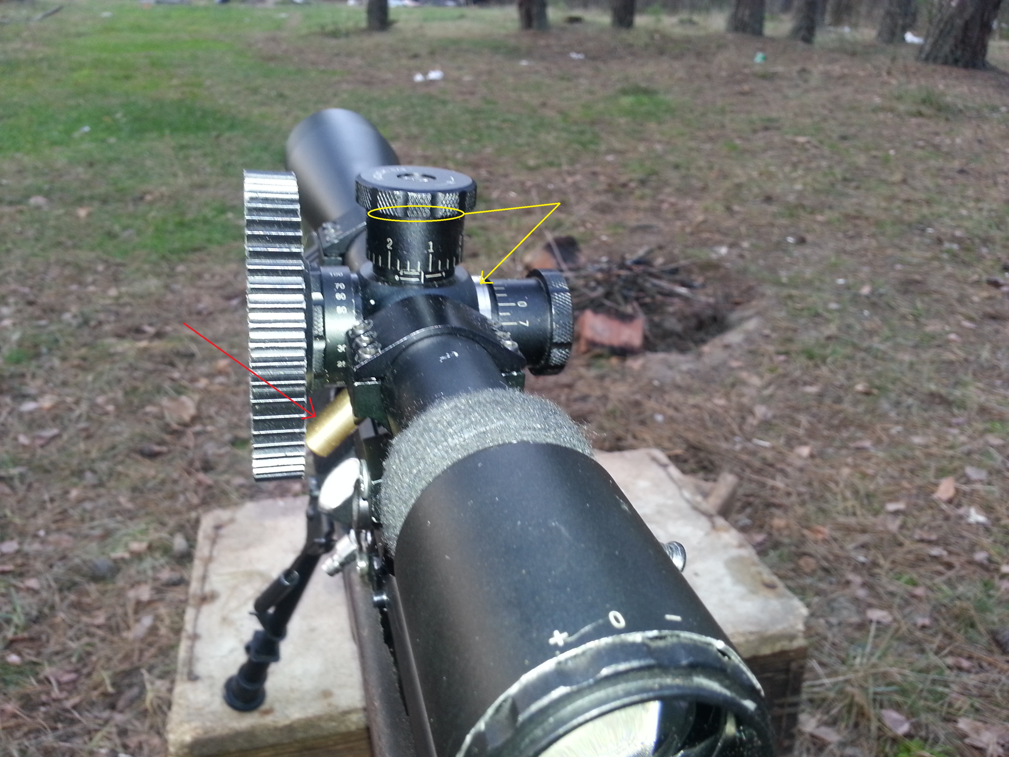 Нужно просверлить дырку в корпусе прицела, под 45 град. относительно осей барабанов, соблюдая границы кольца, на которое давят барабаны.