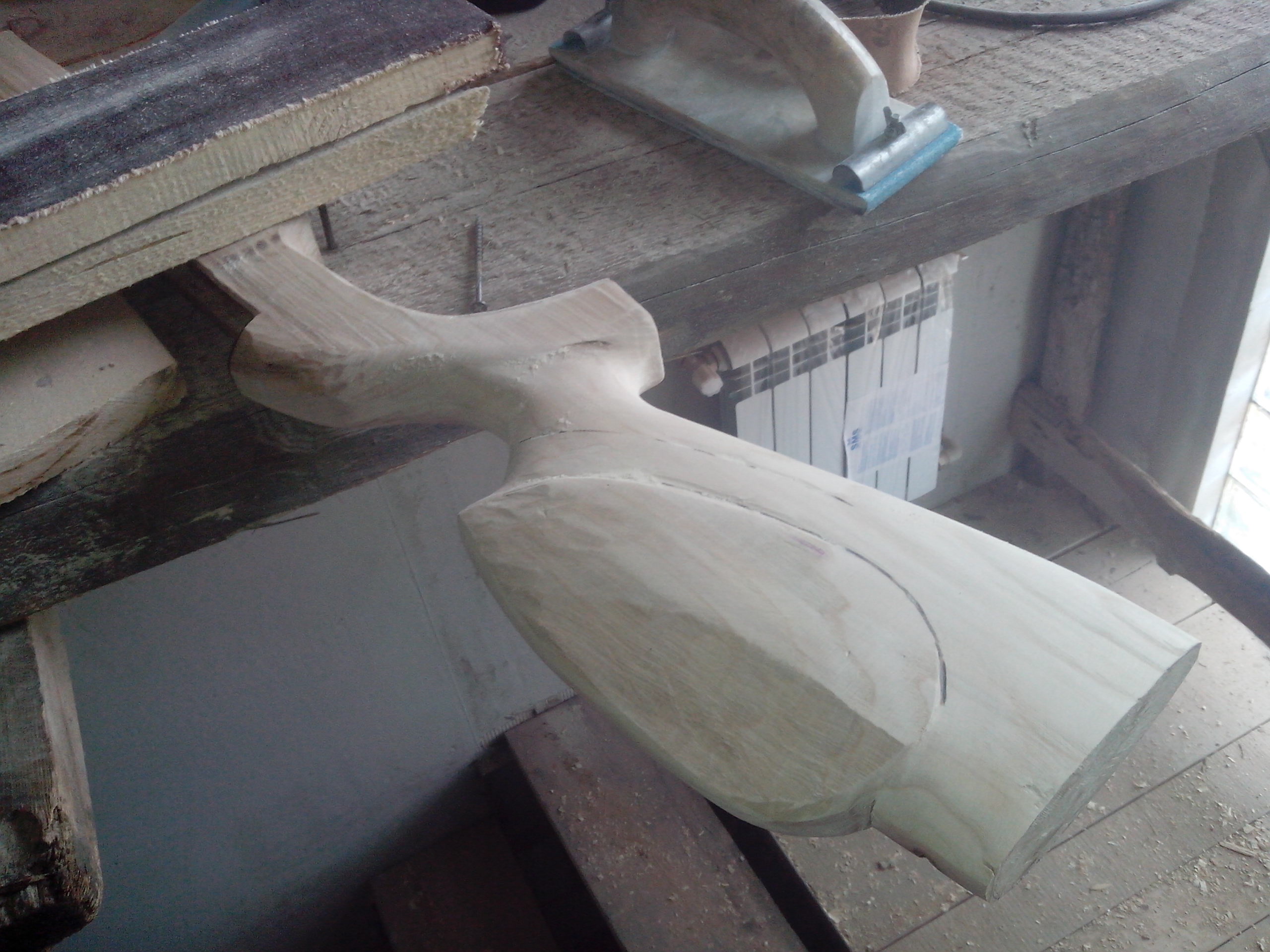 Уважаемые камрады, хочу предложить вашему вниманию буратину собственного производства в картинках. Началось с того, что после установки оптики на смерша р11 стало очень неудобно целится. Не скажу, что приклад смерша неудобный, он вполне пригоден для открытых прицельных, но после установки оптики он становится бесполезным для стрелка. т.к. линия прицеливания поднимается над прикладом до неприличного состояния. И так цели поставлены задачи определены - полено (вроде ясень, может граб) найдено в закромах, на нем начерчено примерно то, что хочу видеть, берется в руки электролобзик и оппппппа, через пол часа работы от перегрузки дым вонь и лобзика нет. Начинаю включать логику и вспоминаю о наличии пилорам с соответствующим оборудованием и спецами. Нахожу столяра, который за 100 тыров пилит мне буратину и делает черновую выборку под железо.