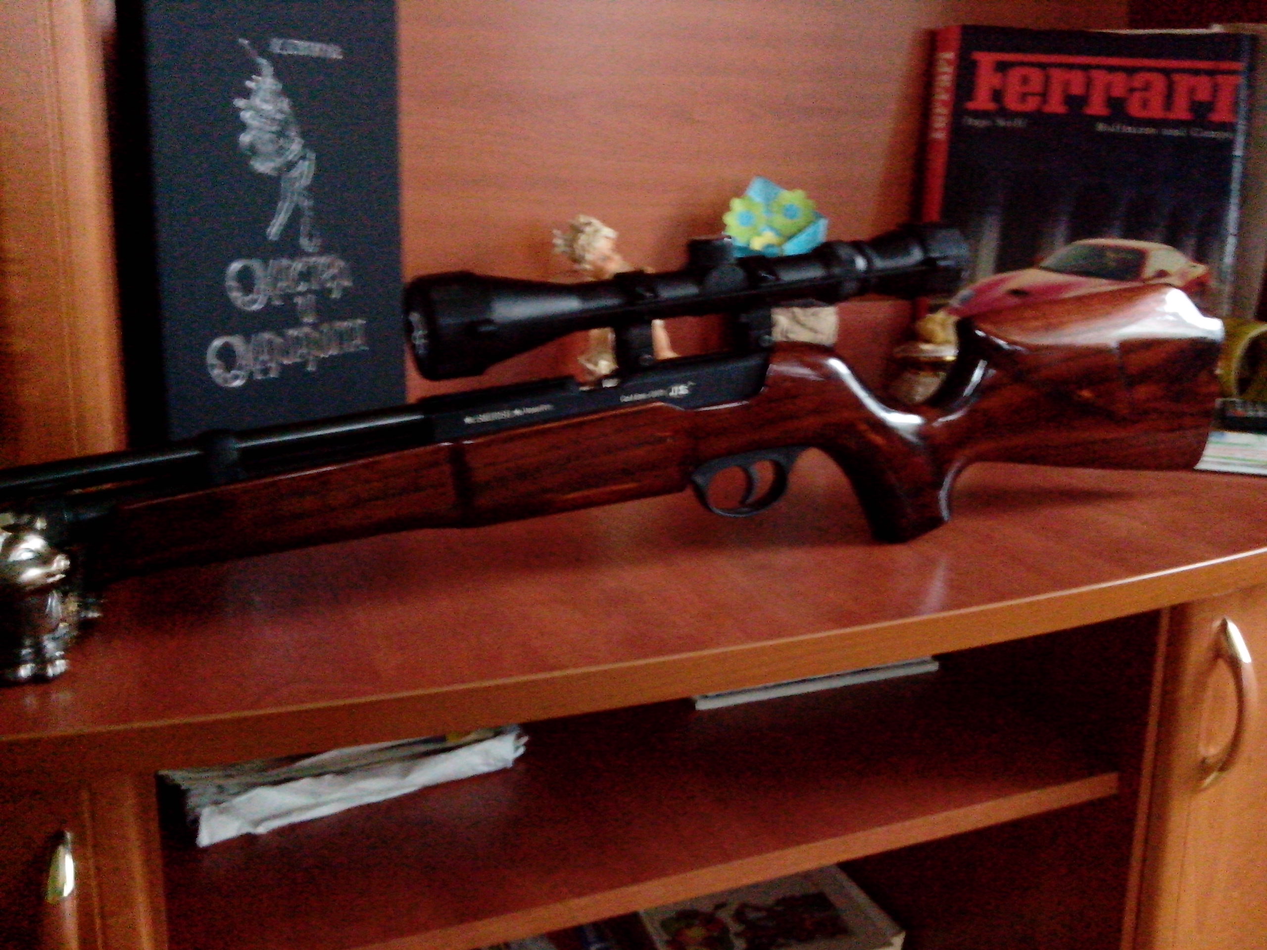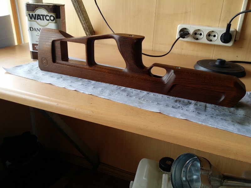 За три дня я положил шесть слоев лака, объясняю почему шесть, ночью я конечно не красил, но по малярному феншую ложится два слоя один для схватывания с отшлифованной поверхность (он может быть матовым), второй после сушки примерно в 10 минут финишный для глянца. При покрытии лаком второго слоя есть большая вероятность образования подтеков. Страшного в этом ничего нет, можно после высыхания их аккуратно спилить и заполировать, я пошел другим путем по малярному принципу "если пошел подтек дай ему дотечь до низа детали", т.е. при покраске ложе висело прикладом вниз и после образования подтека я не жалея на СЫРОЙ лак ложил еще слой, а то и два давая подтеку уходить вниз до среза приклада, после высыхания легко удалить лезвием, вместо муторного замывания лака. Постепенно все косяки вызванные структурой дерева уходят и образуется равномерный слой лака. Так как в глянце ложе не смотрится (блястит как у кота бляха) заматую его на мокрую 2500 наждачкой с последующей полировкой (пробовал на промежуточных слоях смотрится на много лучше) и сделаю тыльник на приклад (пока нет вдохновения и времени).