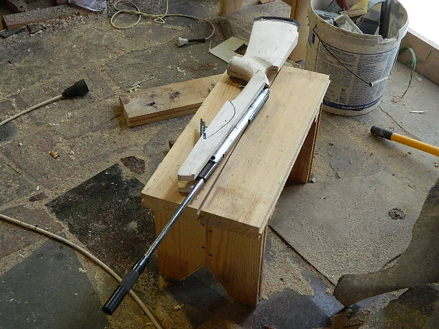 либо второй вариант - уже готовый приклад с затыльников доведённый до нужной формы но пока ещё в массиве, аккуратно пропиливаем в том месте где должна проходить белая вставка, и в место пропила вставляем пластик, обрисовываем его по форме приклада, вырезаем до нужной формы с запасом, скручиваем вместе с прикладом и затыльником, и доводим до гладкого массива наждачкой. но в этом варианте нужен кусок пластика равный по толщине распилу от пилы, дабы не было смещения формы конструкции.