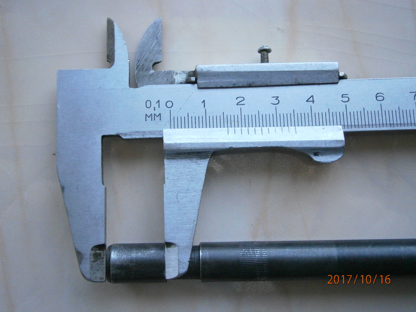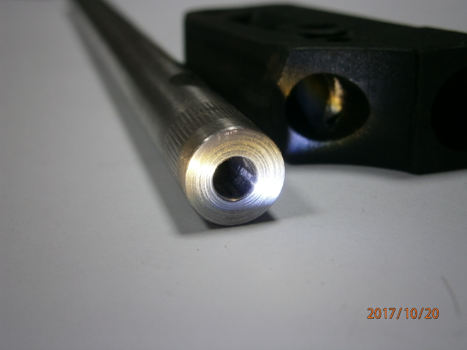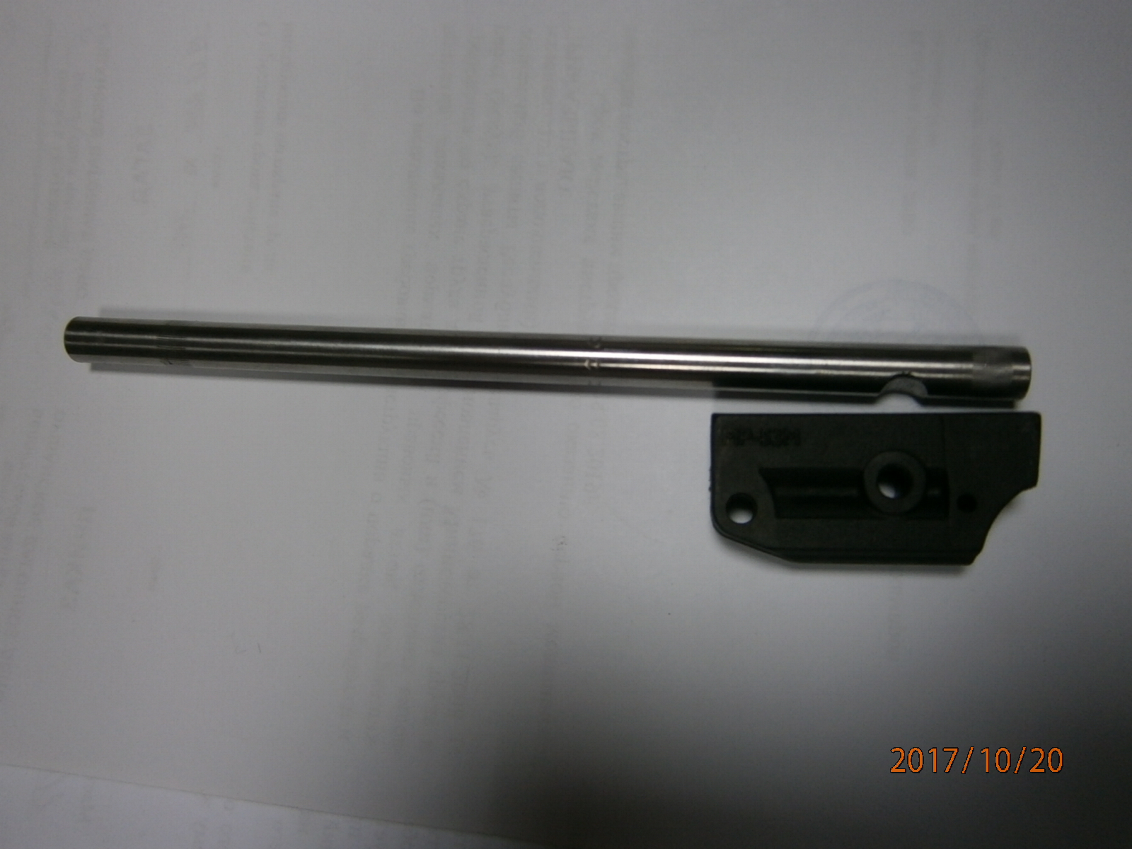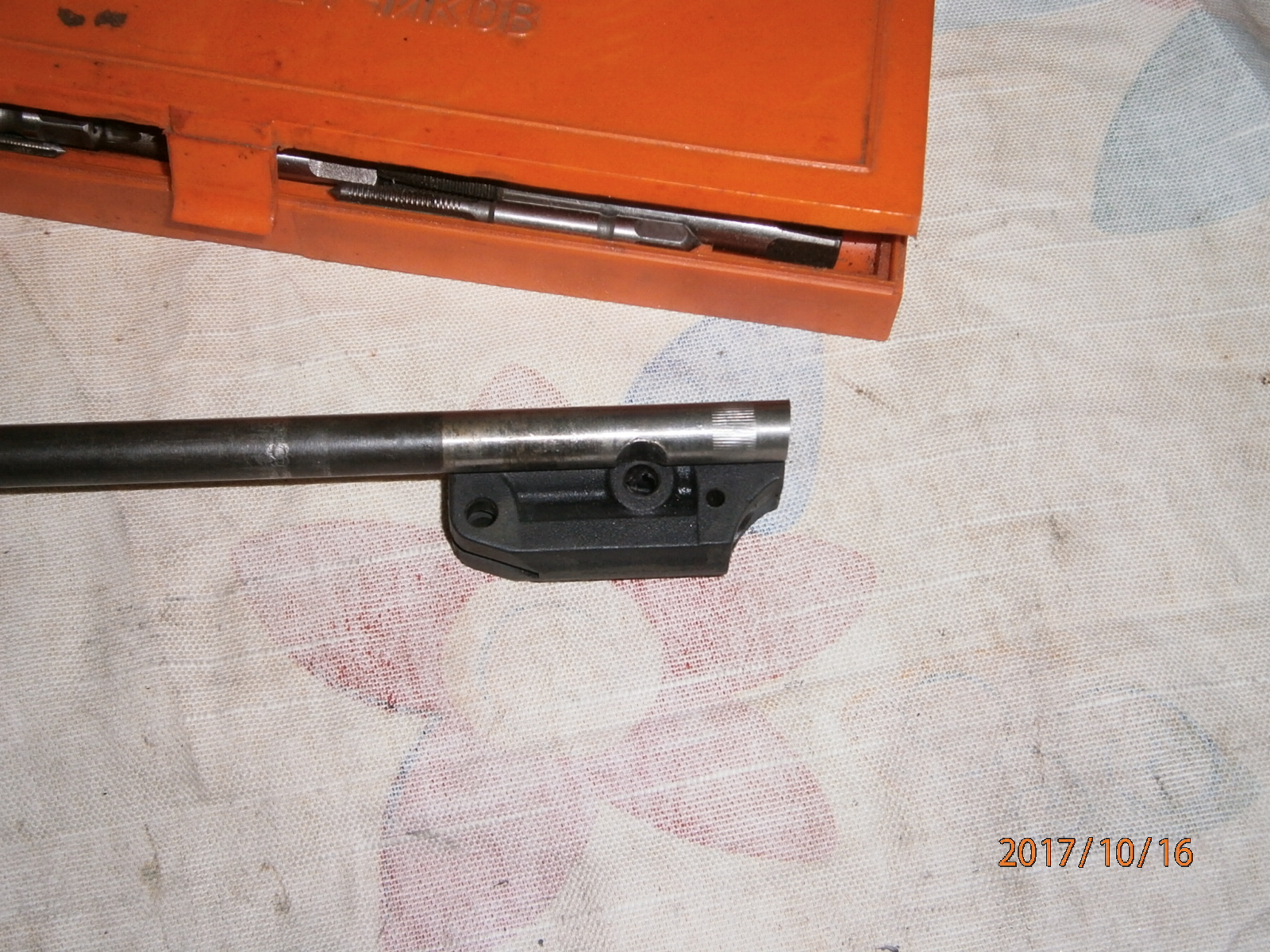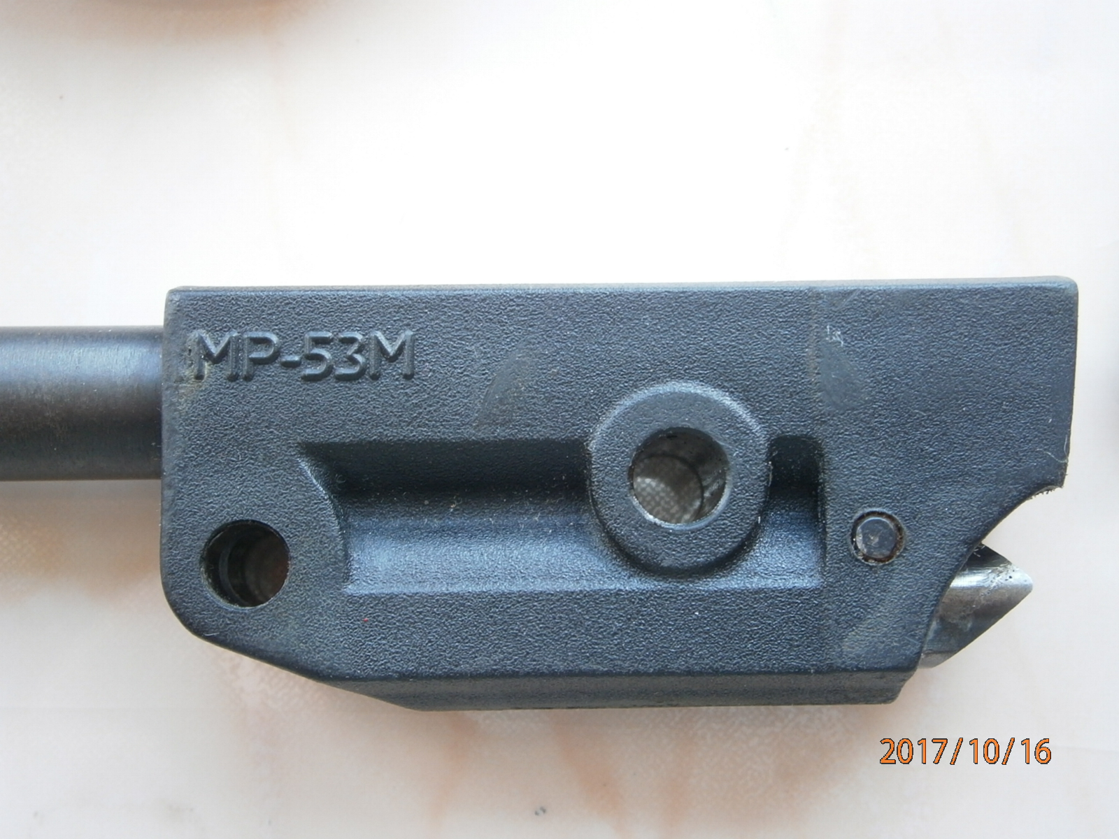 вобщем прикупил МР-53 с пластиковой муфтой. ГП, надульник, съёмный складной приклад -мечта автомана :ya_hoo_oo: . только на 10 метрах куча ниочём :cry_ing: . формат А4 не всегда ловил маслины. перепробовал весь доступный в нашем магазе свинец, но всё безрезультатно. стало ясно, что косяк кроется в стволе после детального осмотра оного. на фото видно светлая полоса псевдочека под проточкой на стволе.