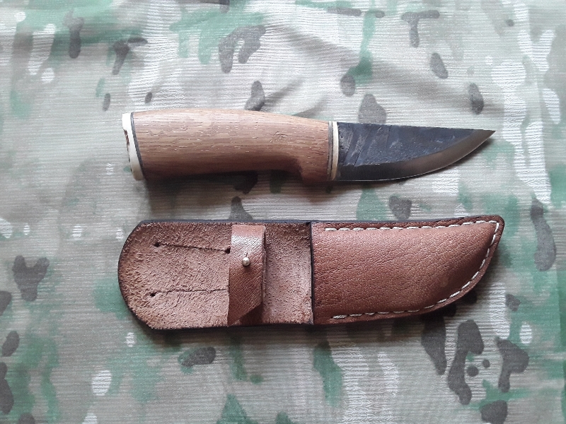 Рукоятка изготовлена дуба и рога лося, дерево пропитанно тунговым маслом.