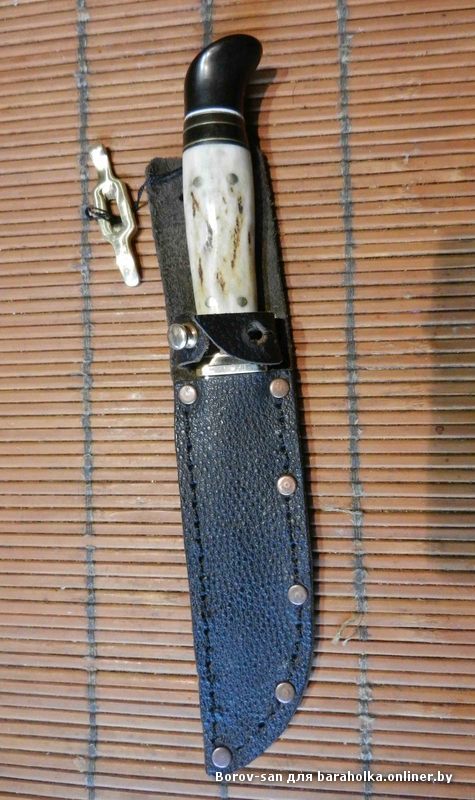 Продам нож из шведского быстрореза фирмы ВАНСО. Клинок 102х28х2,25 спуски прямые высотой 12,5 сведение в 0,2-0,3мм. Гарда дюралетитановый сплав, рукоять морёный дуб. Пропитан и покрыт смесью масел против проникновения влаги. Ножны: кожа хим. дубления толщиной 3мм. подвес свободный на карабин. Цена 700 тбр.