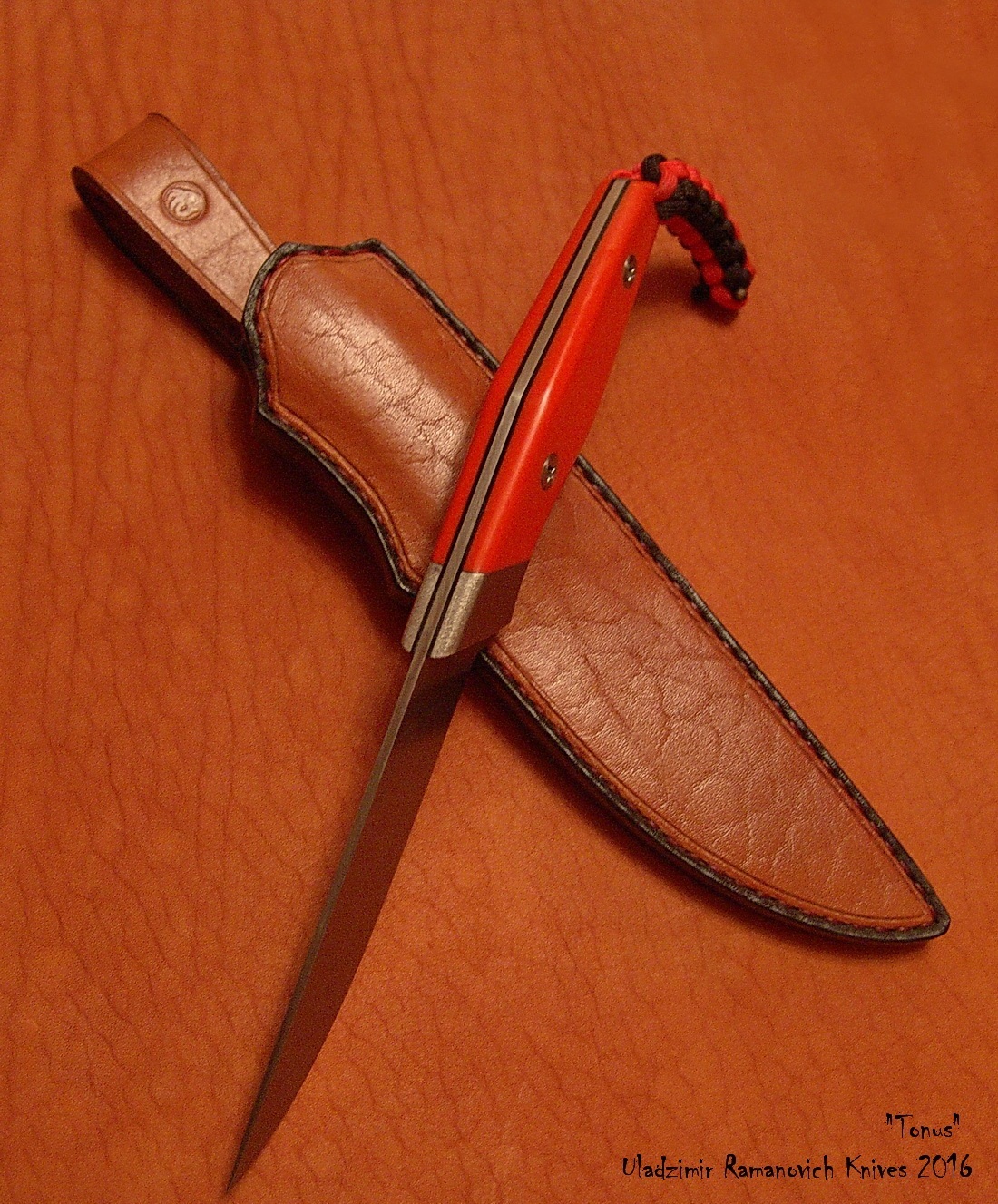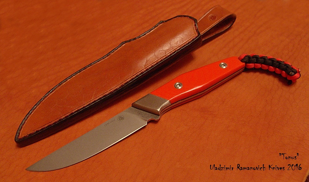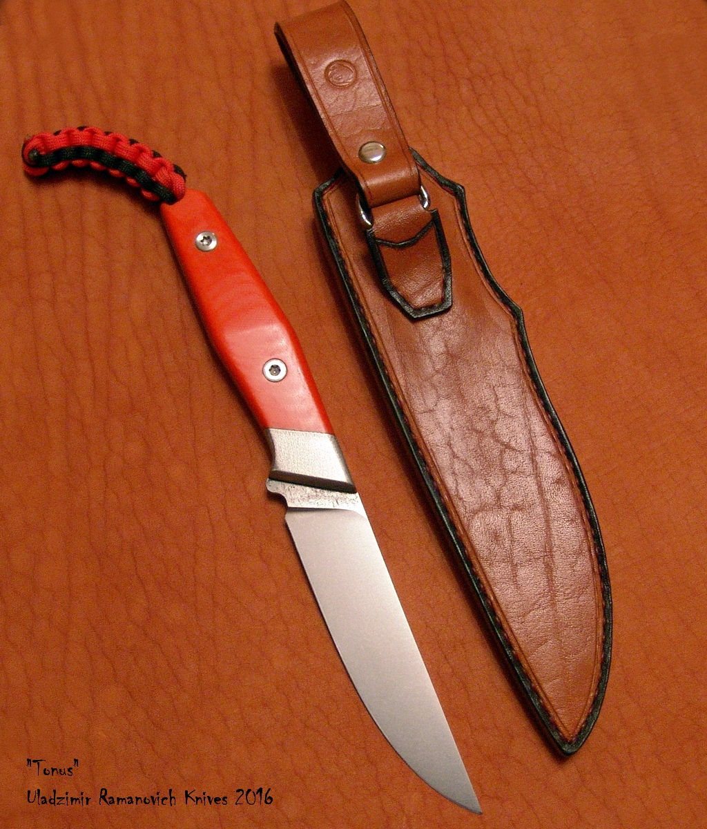 Нож "Тонус", клинок: сталь CPM S90V, твёрдость 60-61 HRC (крио), длина клинка 122мм, ширина 26мм, толщина 2,7мм, галтовка. Рукоять: длина 123мм, оранжевая G10, больстер: титан, винты: нерж. исправленные по геометрии. Ножны - кожа. Цена 425 руб., тел. +375-25-738-90-48, Владимир