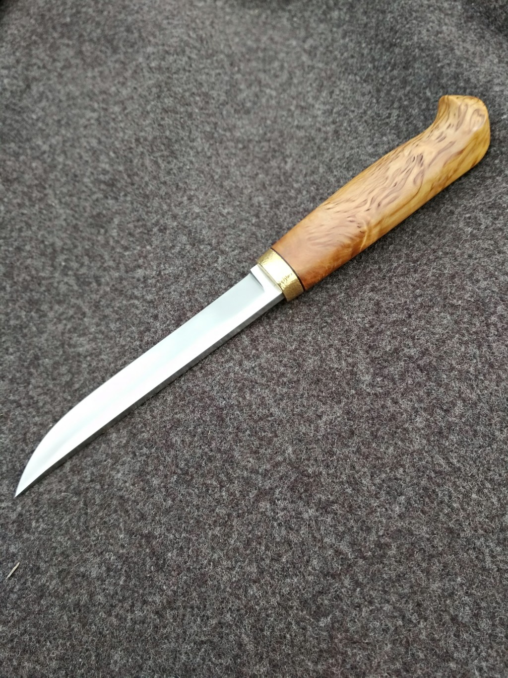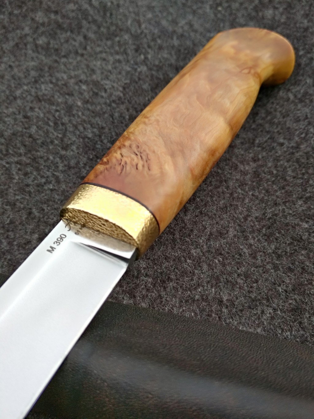 Рукоять: карельская берёза, пропитка в вакууме нат. олифой, латунь, плечики клинка в больстере на 1.5-2 мм.