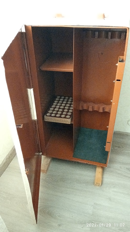 Продам сейф для хранения охотничьих ружей. Металлический, заводского изготовления, армейского образца. В70, Ш40, Г30. Оборудован ручками для переноски, разделен на 2 отсека, полки, отверстия для крепления к полу и стене. Метал достаточной толщины, замок внутренний. Вместительный. Хранилось 2 гладкоствольных ружья в разобранном состоянии, б/п, чехлы, различная амуниция. На фото оклеен на самоклейке обоями для неброскости в комнате. По стоимости 90 руб. с разумным аргументированным торгом. Не срочно. Минск. +375(29) 58 64 997.