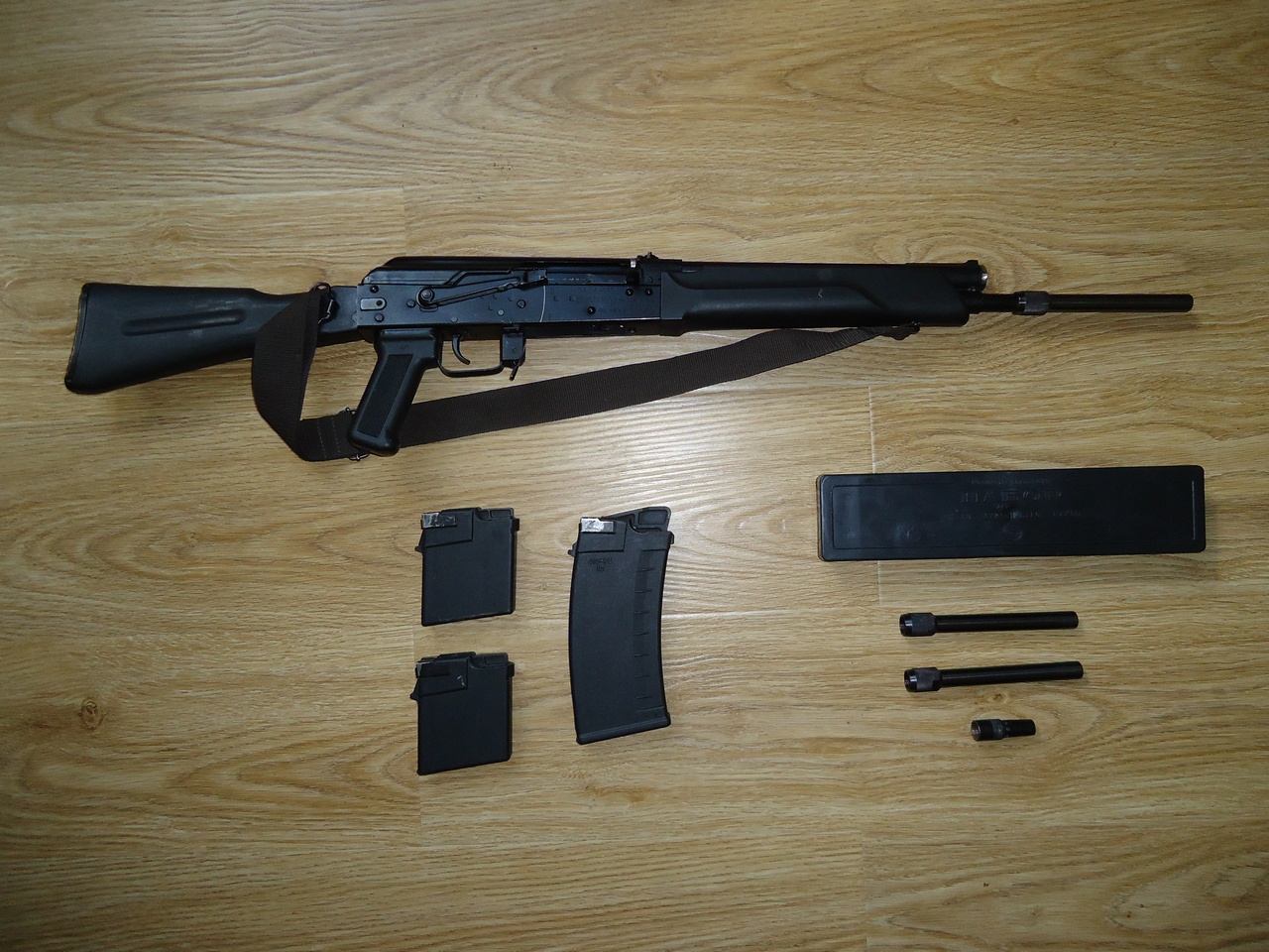 1) Сайгу-410К 1995 г.в. Состояние хорошее (снаружи есть потертости и мелкие царапины, внутри ствол - "зеркало", автоматика работает отлично). 2 магазина на 4 патрона каждый и 1 магазин на 10 патронов. Набор для чистки ружья .410 (36) калибра. Порох "Сокол" 2 банки (отдельно нельзя). Капсюли ЦБО 200 шт (отдельно нельзя). Немного пулевых патронов "Азот". Цена 300 руб.