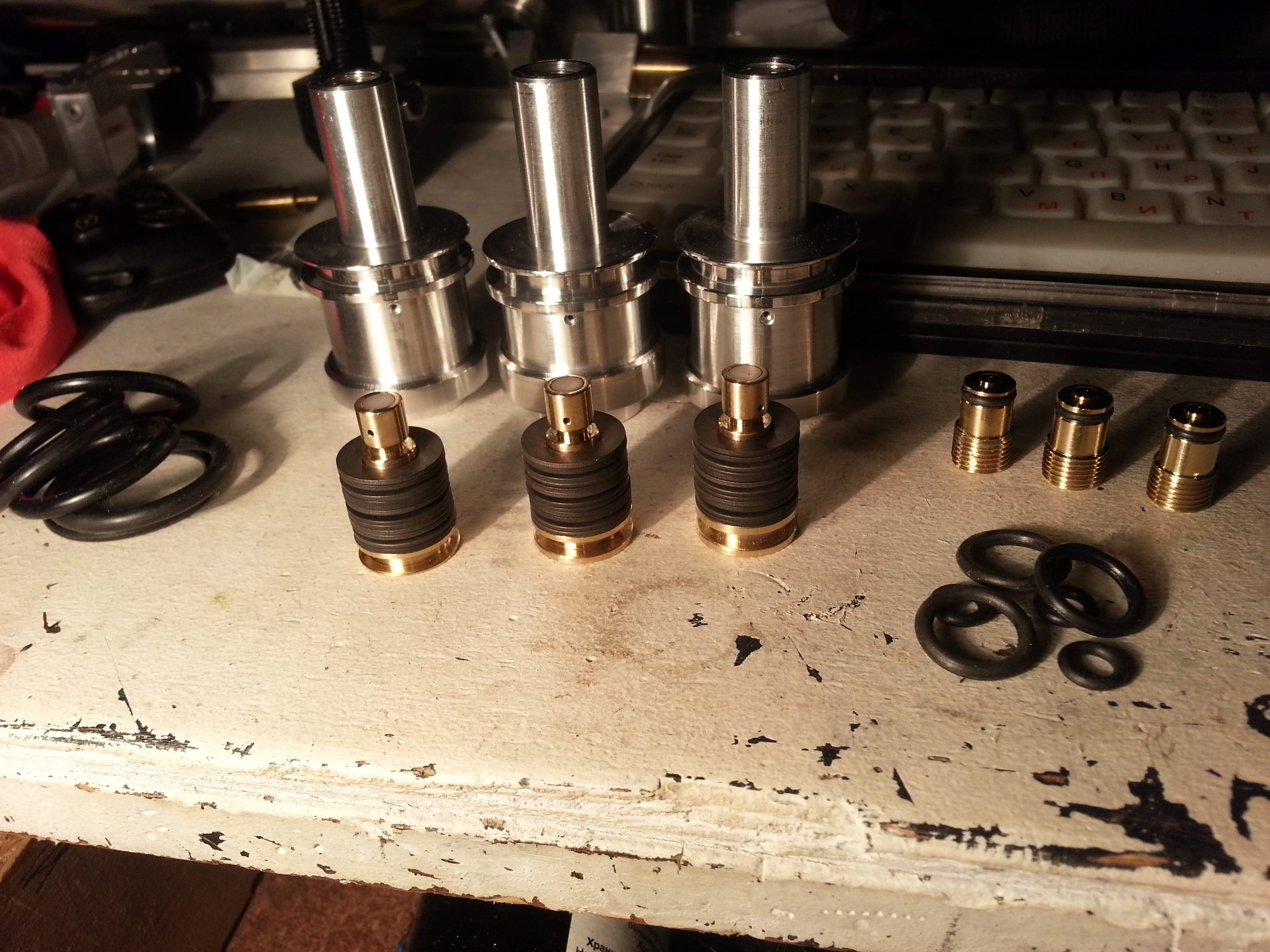 Фото свежего редуктора на кит Крюгера. Срок исполнения вышел два дня с настройкой и тестами. Цена на сегодняшний день =80, как на любой вставной. Уплотнение внутри пробки, поршень примерно посередине редуктора, и часть редуктора, находящаяся в пробке, полая - так сохраняется приличный заредукторный объем.