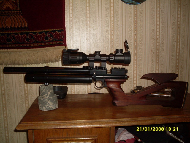 Кит Крюгера, резик 290, труба ударника от Крюгера, облегчённый ударник+пружина, новая коробка Крюгера с продольно-скользящим затвором+хомут, дополнительно установлена восьмёрка с бородой и ластой, ДВА допмодера по 2стакана в каждом. Был собран в январе 2014 года.На девайс установлен приклад от ALMAZa, очень удобный, из термоясеня. Оптический прицел-миник Tasco 3-9x40 с уровнем, отстройкой парралакса, тактическими барабанами и синей регулируемой подсветкой сетки (Милдот). Кольца быстросъёмные с изменяемым диаметром 25,4-30мм. В комплекте один барабанчик.