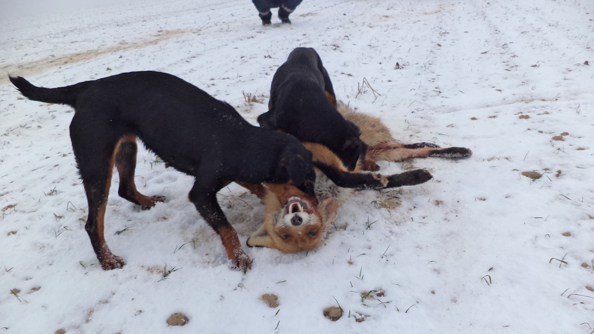 Вот маленький отчёт.На подходе к карьеру с норами ,замечаю много лисьего следа .Карьер большой ,попутно решаем топтануть серого,идём с братам по краям ,а собаки по серединине.На подходе к норам собаки заметусились(ну вот думаю и пришли).Но собаки обнюхав все входы ,норится не хотят и идут к траве.Цепляют свежий след лисы и уходят за метров 600.(Лиса облазив всё, легла в траве и услышав нас ,ушла неподпустив близко.)кое как отзываю собак и идём в следующий карьер(в прошлом году там взял в плен лису,а в этом году ещё небыл)Пришли ,три норы без признаков жизни,а вот последние два входа наоборот.Запускаю молодого и меньше чем через 20 секунд с другого входа вылетает КУМА ,Отпускаю на метров 25 и бью,падает замертво.Я уже и забыл когда такой быстрый выгон с норы был.Лиска молодая и маленькая.Дойдя до машины и перекусив, слышим два выстрела,они раздались из перелеска километра 3 от нас.Через минут 10 собравшись ехать дальше замечаем идущую лису в метрах 100 от нас.Стоим возле кустов ны выгоне и она идёт по выгону в сторону озимых.Заводим машину догоняем ,один выстрел начинает вилять и снижать скорость,быстро выпускаю собак и они мчат за ней.Лис увидев собак выравнивается и несётся как не в чём не бывало, выбежав на жито ёщё пробегает метров 300 и садится занимая оборону.Первая подлетает сучка хватка пасть в пасть и молодой приходит на помощь.Лис крепкий (но львиный хвост)зубы очень большие.(при хватке прокусил суке язык)